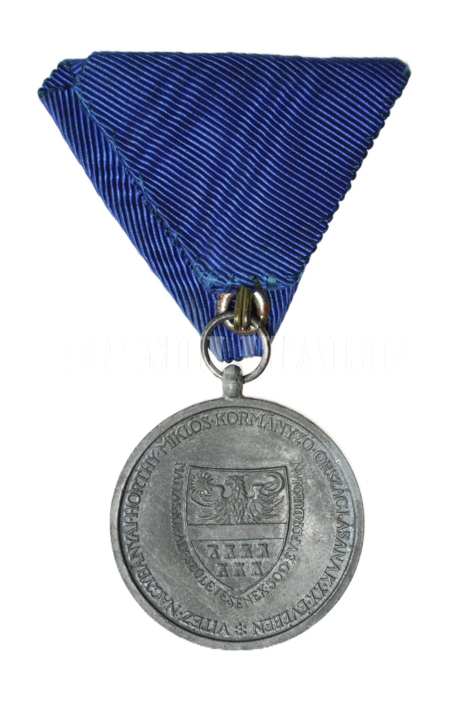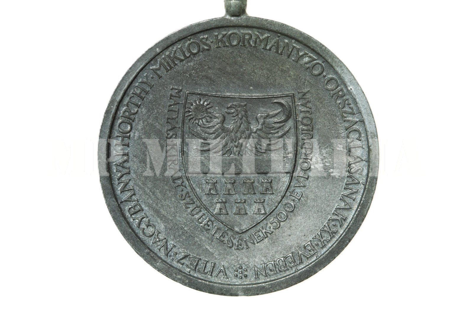 As armas da Transilvânia entre a inscrições “Mátiás · Király · Szüle Ésének · 500 · Év Fordulóján” e na orla a inscrição “´Vitez · Nagybanyai · Horthy · Miklos · Kormanyzo · Orszaglasanak · XX · Eveben”.