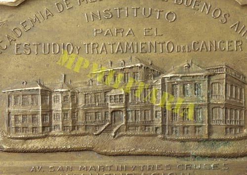Anverso: No campo o prédio do Instituto acima a legenda: “Academia de Medicina de Buenos Aires – Instituto para el estudio y tratamiento del Cancer”. No exergo entre as datas “Abril XIX – MCMXXII” a legenda: “Av. SAN MARTIN e TRES CRUCES – Inauguraion”.