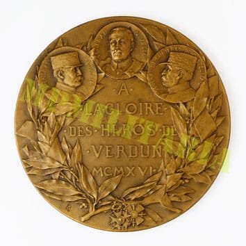 Medalha da I Guerra Mundial A Os Heróis de Verdun “A La Gloire Des Heros de Verdun MCMXV” homenagem aos Generais Petain, Nivelle e Curieres de Castelnau, apresenta a imagem dos três Generais e a imagem da república apoiando o Exército francês desafiando a águia alemã e a inscrição “On Ne Passe Pas”;