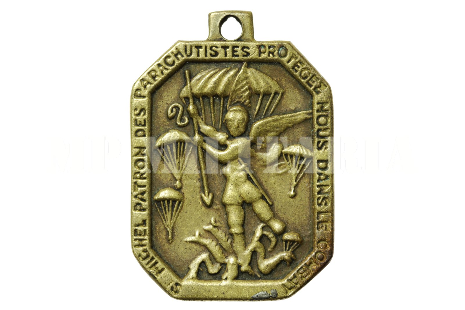 Medalha de proteção usada como placa de identificação de um Oficial do paraquedista do Exército Brasileiro, no anverso a imagem de São Miguel Arcanjo ladeado de paraquedistas. No reverso, apresenta as inscrições do nome, número de Pqd, número de Comandos e Forças Especiais;