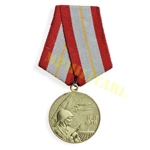 Medalha de 1978 que comemora 60 anos das Forças Armadas 1918 / 1978 soviéticas “60 лет Вооруженных Сил СССР”; Anverso: No campo um militar de capacete empunhando um fuzil, no fundo representando as forças armadas três mísseis, dois caças em vôo e um submarino no mar; Reverso: No centro sobre um fuzil e um sabre cruzados uma estrela com um arado e martelo, na orla a inscrição “Шестьдесят лет – Вооруженных Сил СССР” (Sessenta Anos – Forças Armadas da URSS);
