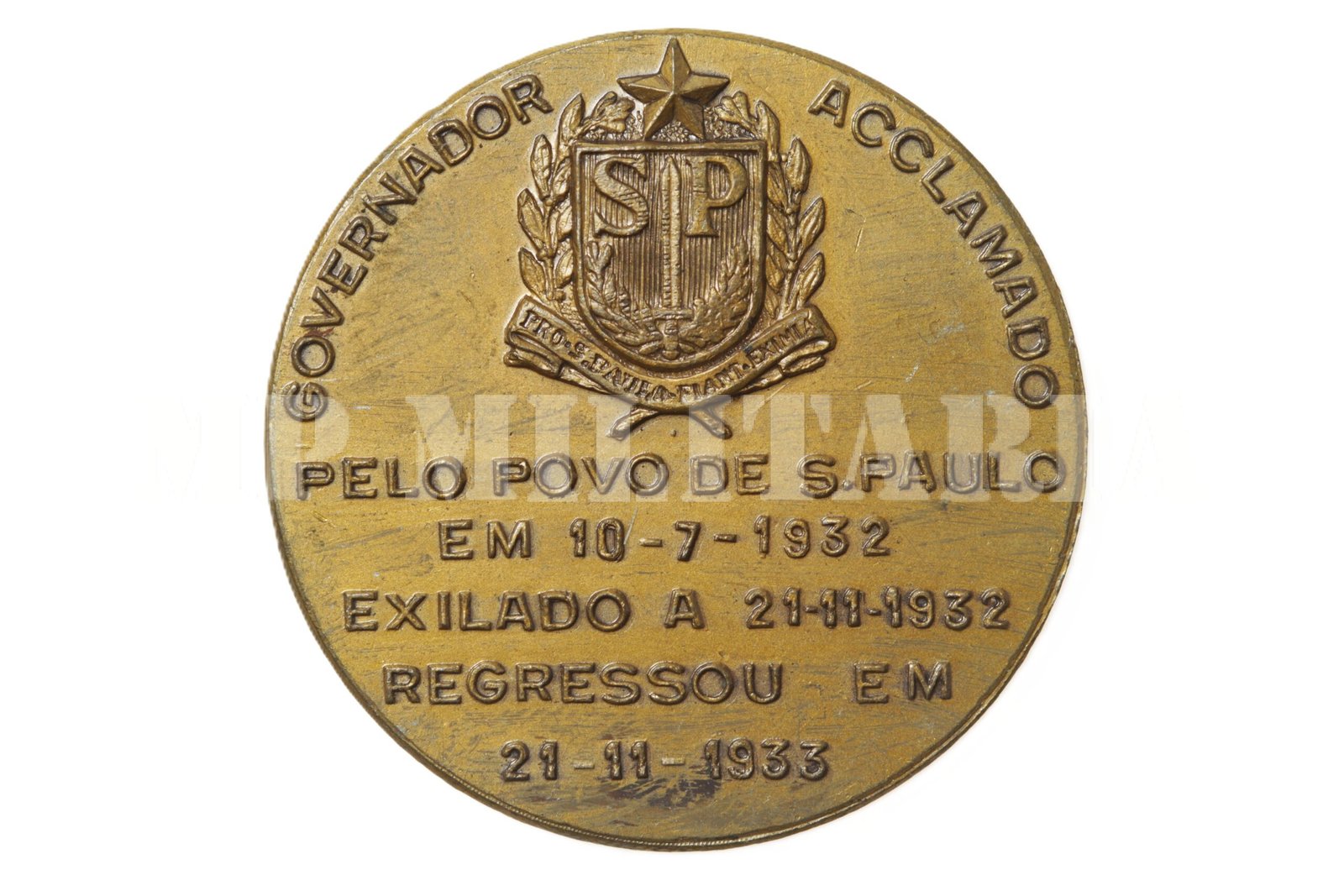 No campo acima entre a inscrição “Governador Acclamado” o brasão do estado “Pró – São Paulo Fiant Eximia” e abaixo “Pelo Povo de S. Paulo em 10-7-1932 ∙ Exilado a 21-11-1932 ∙ Regressou em 21-11-1933”;