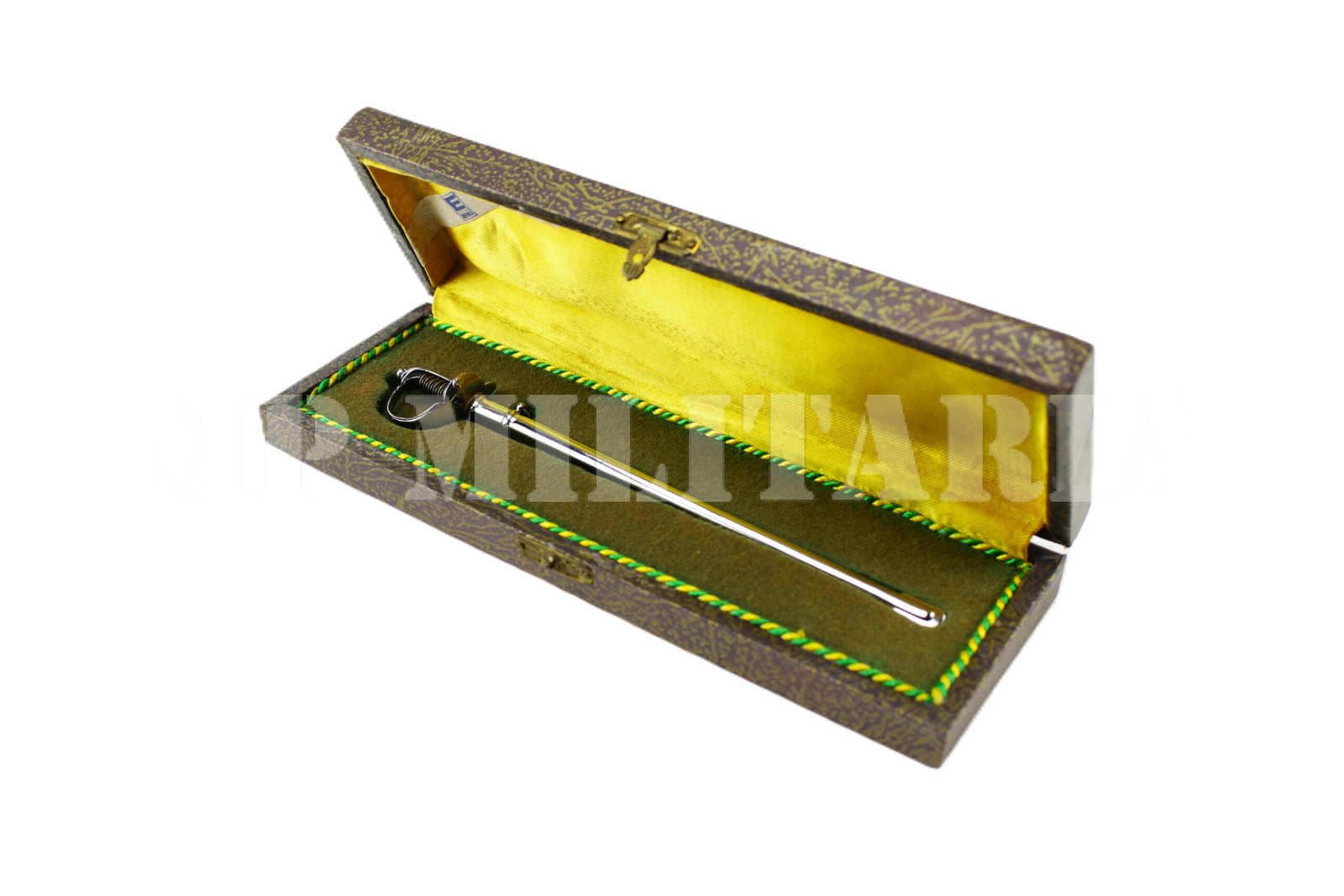 Miniatura da espada de Oficial do Exército Brasileiro e polícia, rica em detalhes com o brasão da república no guarda mão, na caixa e com bainha;