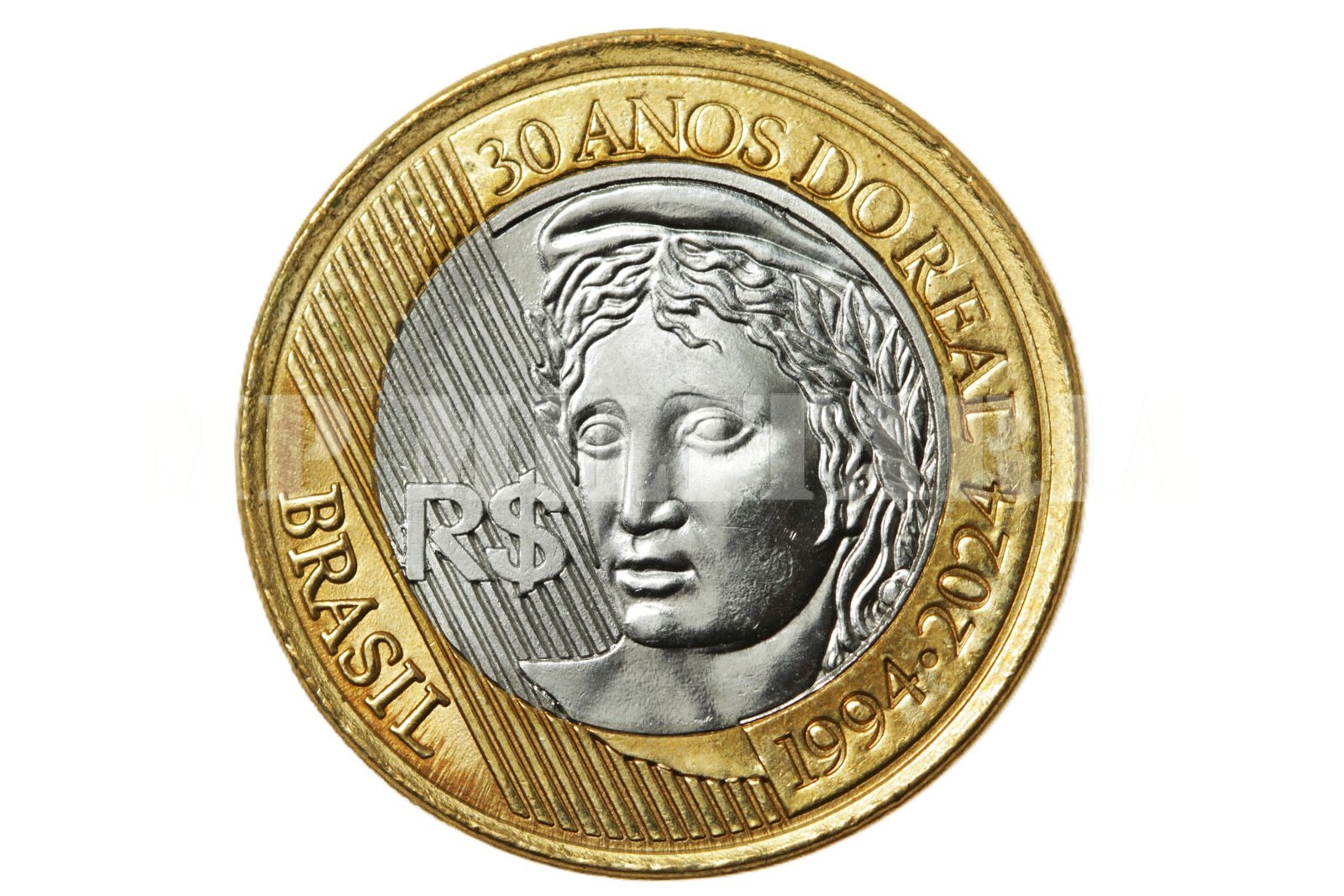 Moeda bimetálica de 1 Real, comemorativa dos 30 anos do Plano Real;
