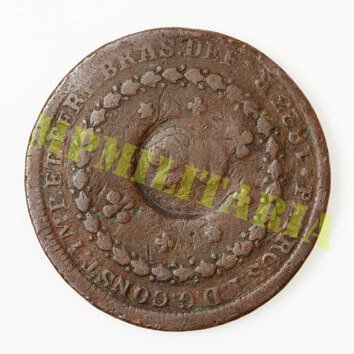Moeda de 40 Réis de 1823 com carimbo geral de 20, cunhada no período do Imperador D. Pedro I e carimbada na época de D. Pedro II na Casa da Moeda do Rio de Janeiro;