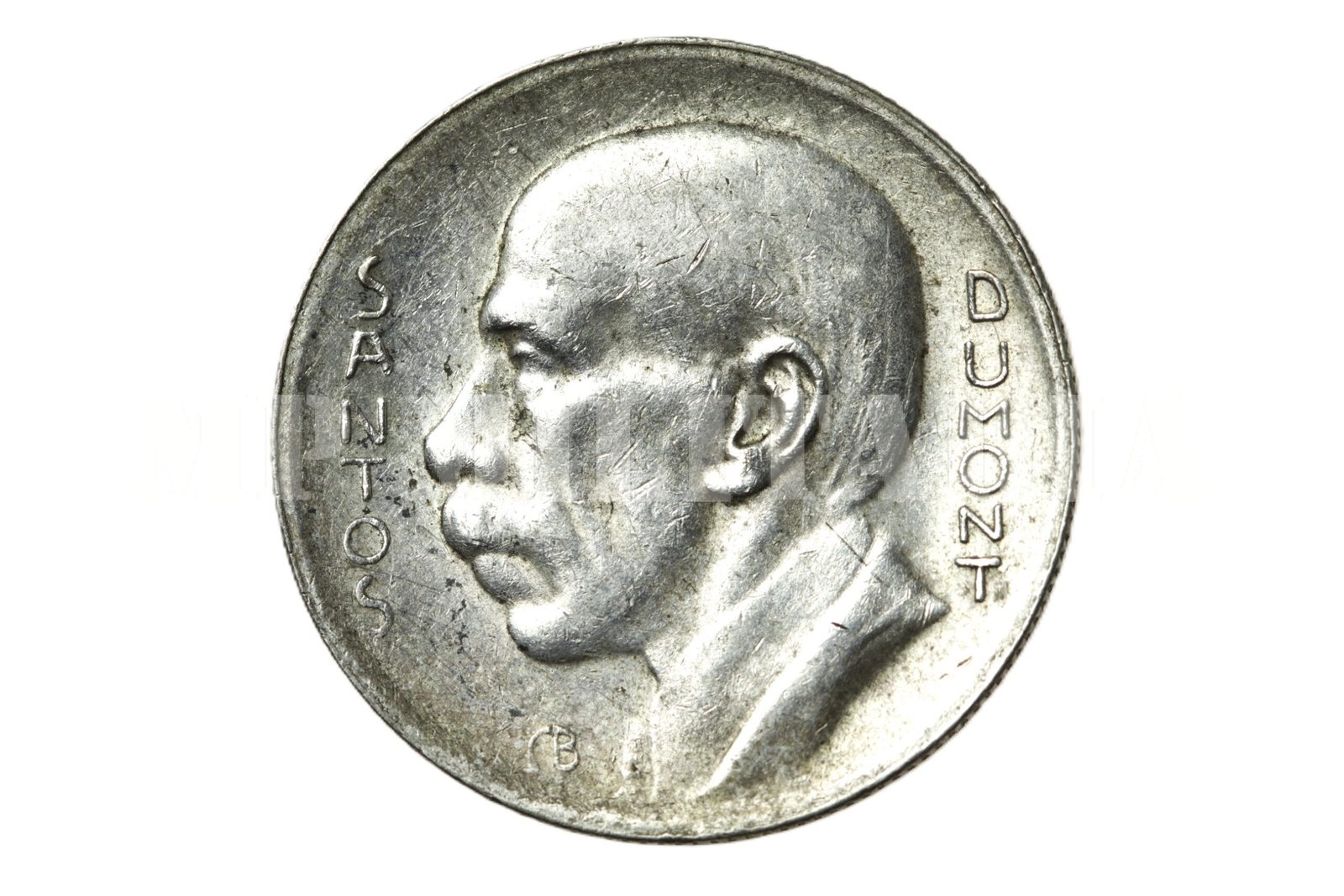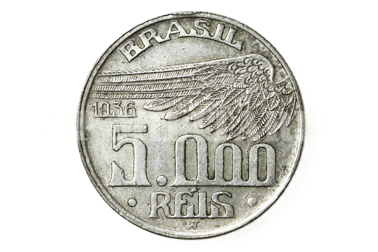 Moeda de 5.000 Réis de 1936, com a efígie do pai da aviação Alberto Santos Dumont;