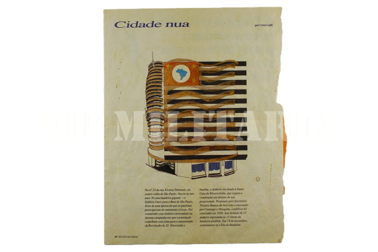Página da “Revista da Folha” do edifício Ouro para o Bem de São Paulo, edifício erguido com as arrecadações da Campanha do Ouro;