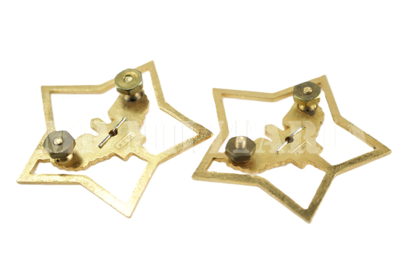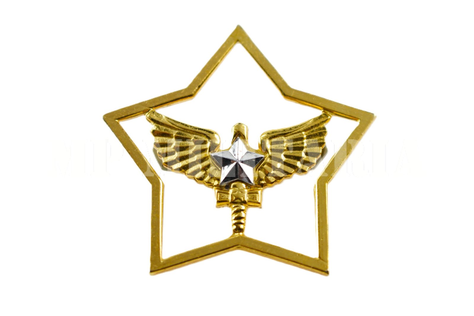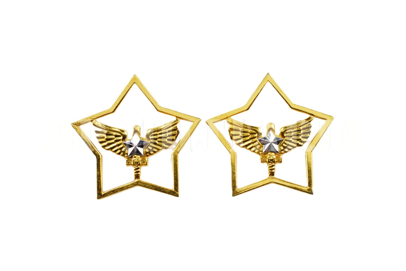 Em metal dourado e estrela prateada;