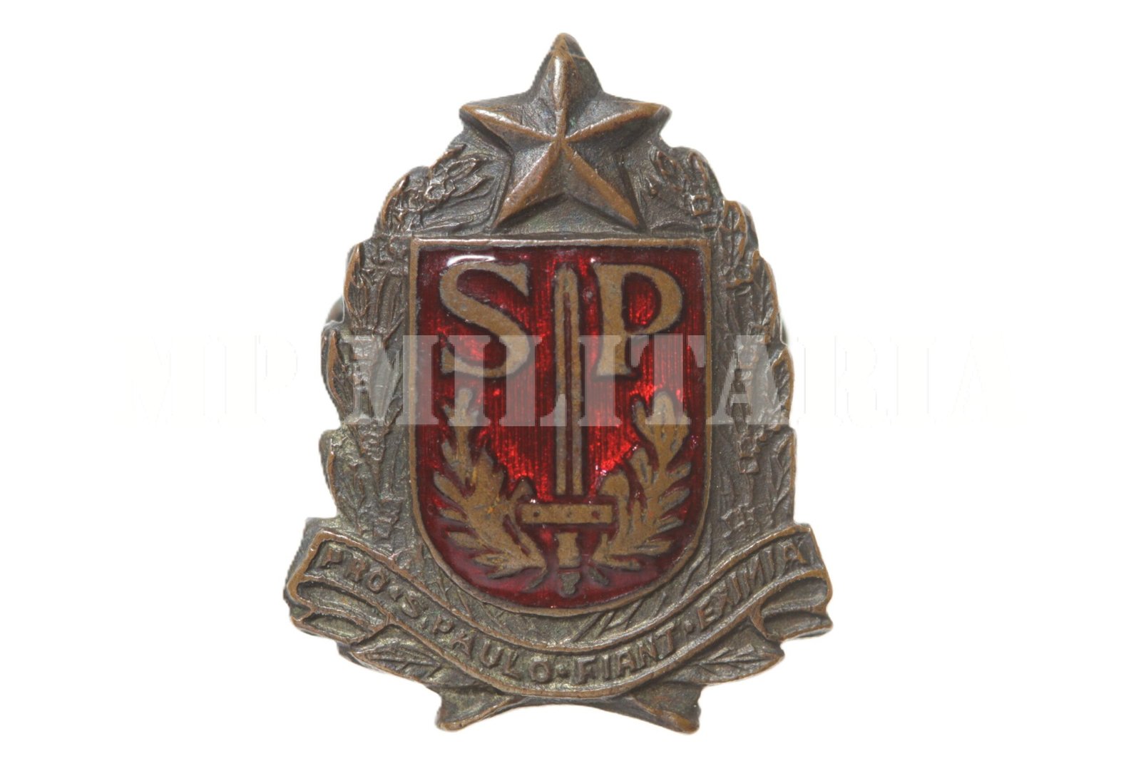 Pin Brasão esmaltado “Pro São Paulo Fiant Eximia” (Por São Paulo Façam-se Grandes Coisas), da época da Revolução de 1932;