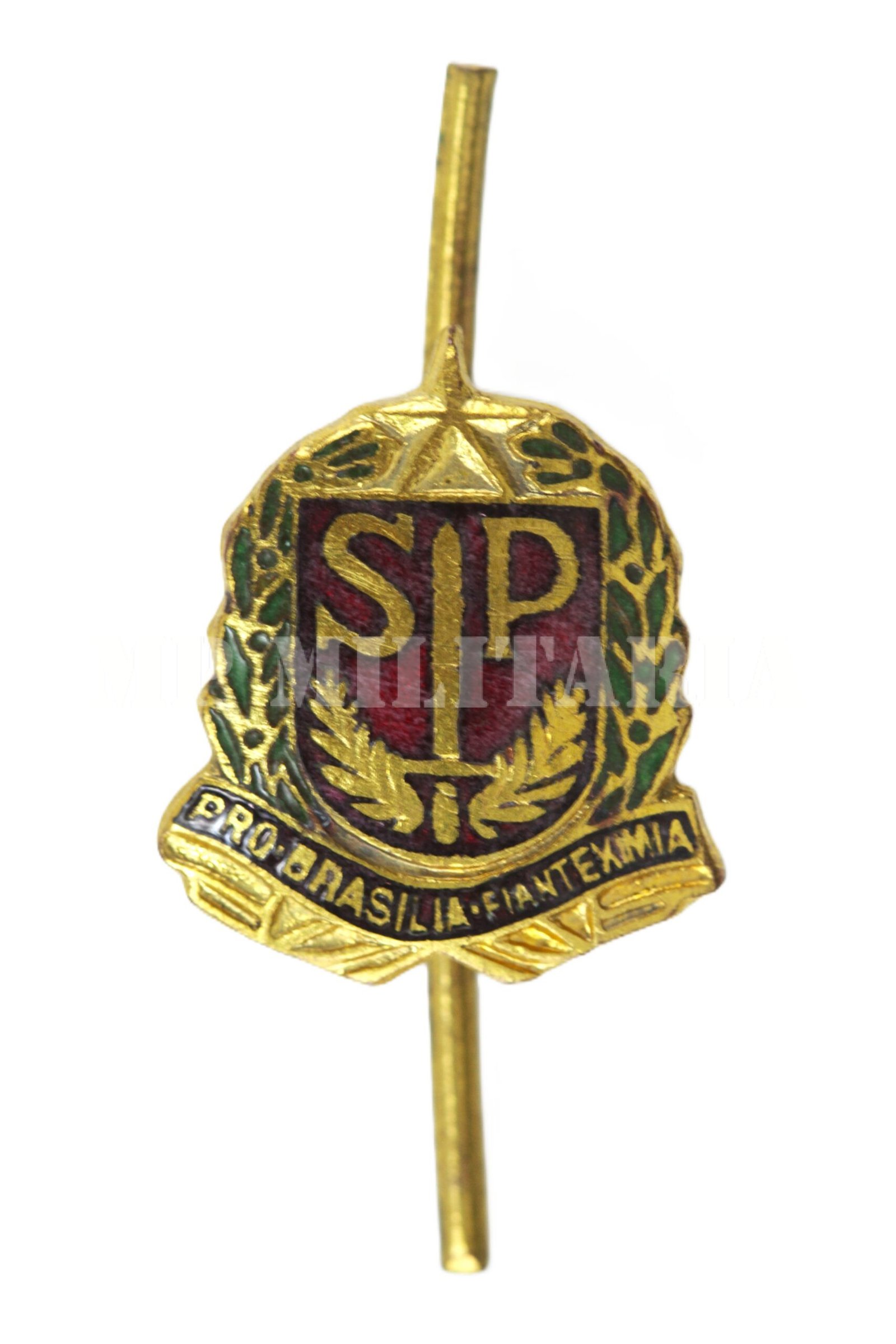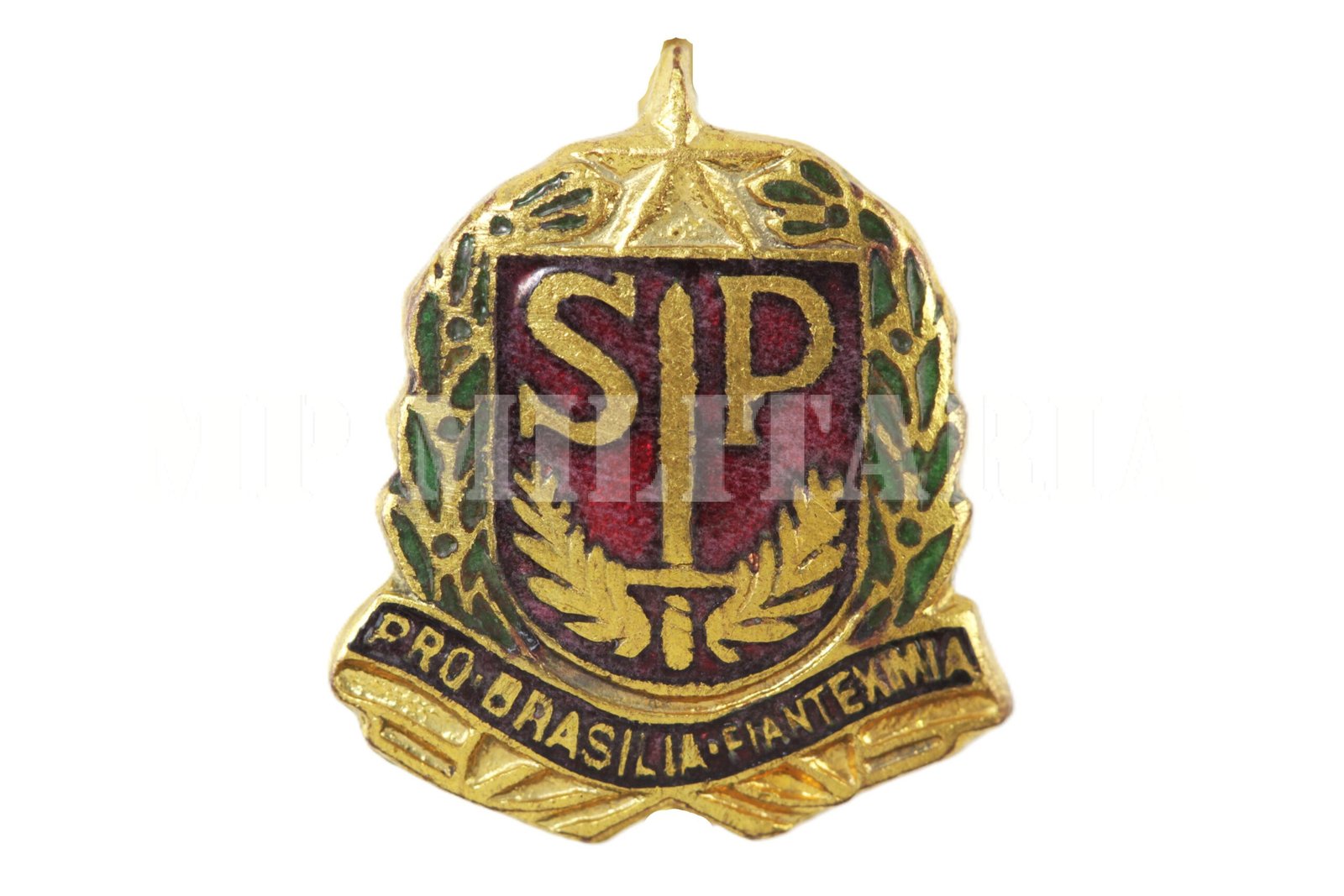 Pin esmaltado do brasão do Estado de São Paulo com a legenda “Pro Brasilia Fiant Eximia”. O brasão foi instituído pelo governador Pedro de Toledo Decreto no nº 5.656 em agosto de 1932 durante a Revolução Constitucionalista;