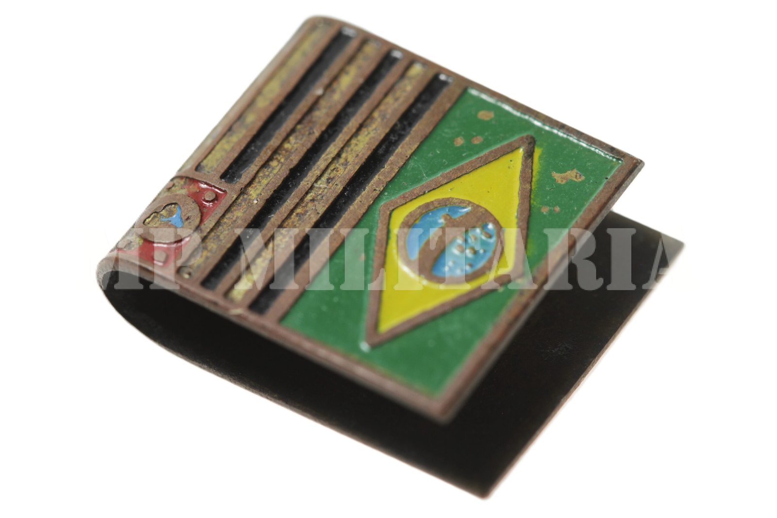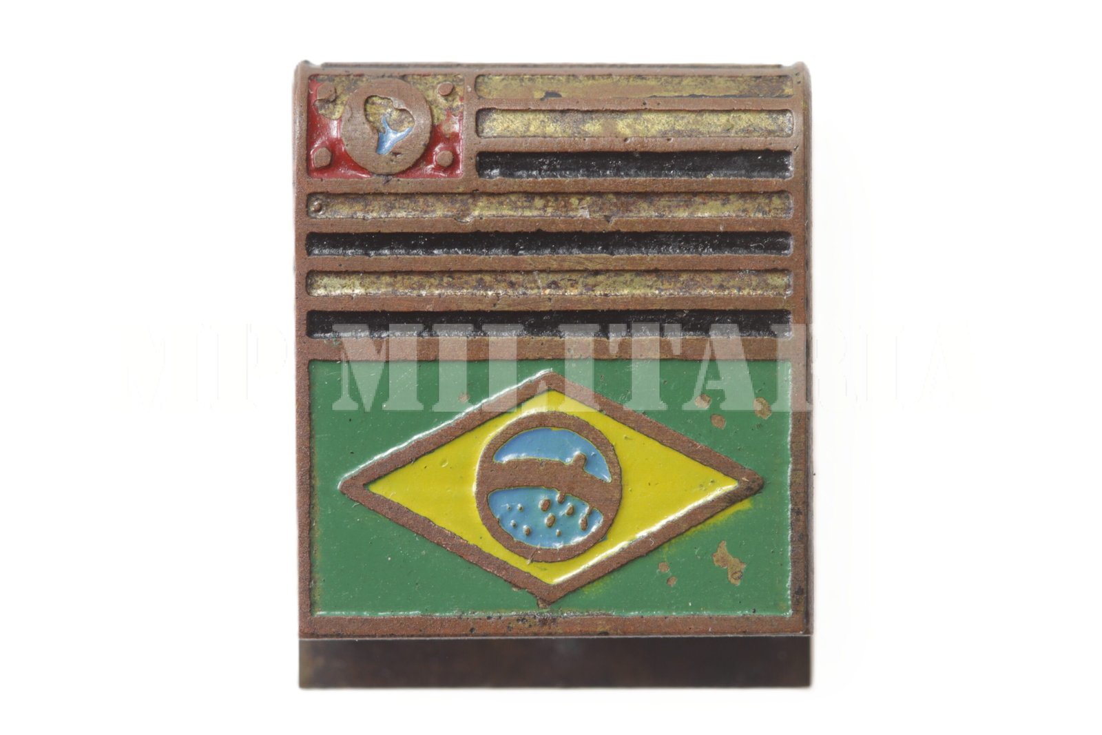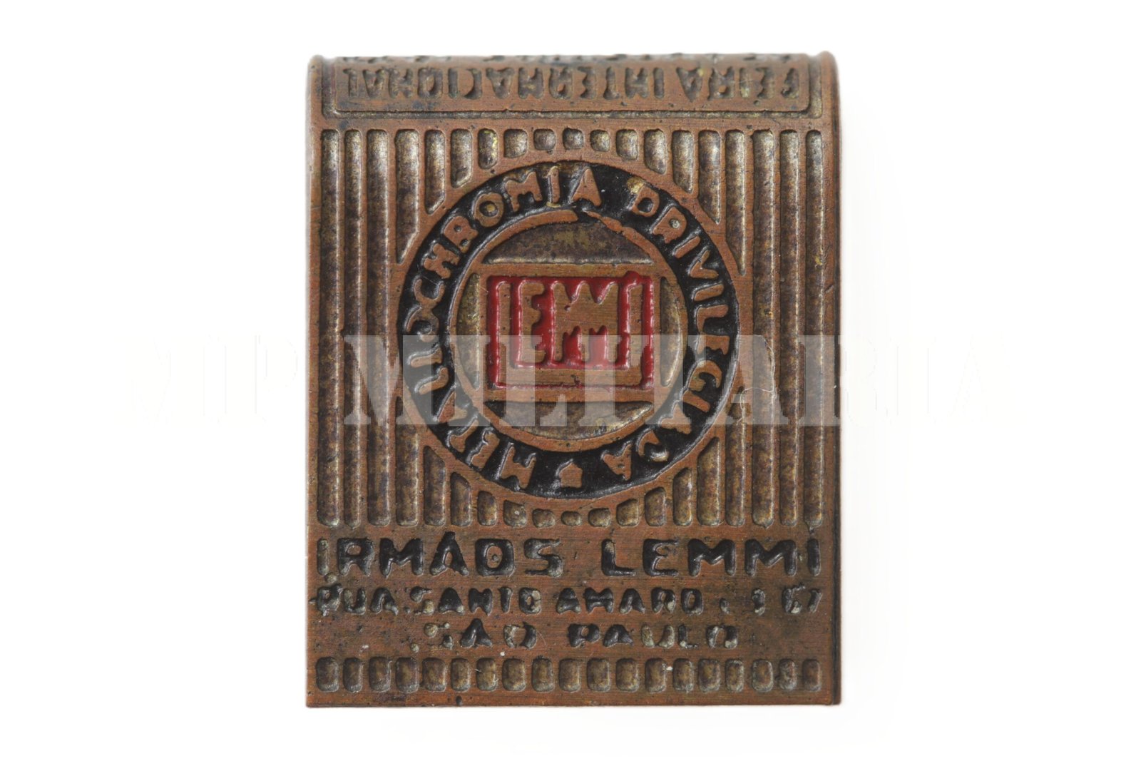 Raro pin / distintivo com as bandeiras de São Paulo e do Brasil, feito em 1933 pela empresa Irmãos Lemmi, para Feira Internacional de Amostras, possivelmente o tema com as bandeiras faz referencia as eleições de 1933;