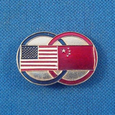 Pin comemorativo com as bandeiras dos Estados Unidos e da China.