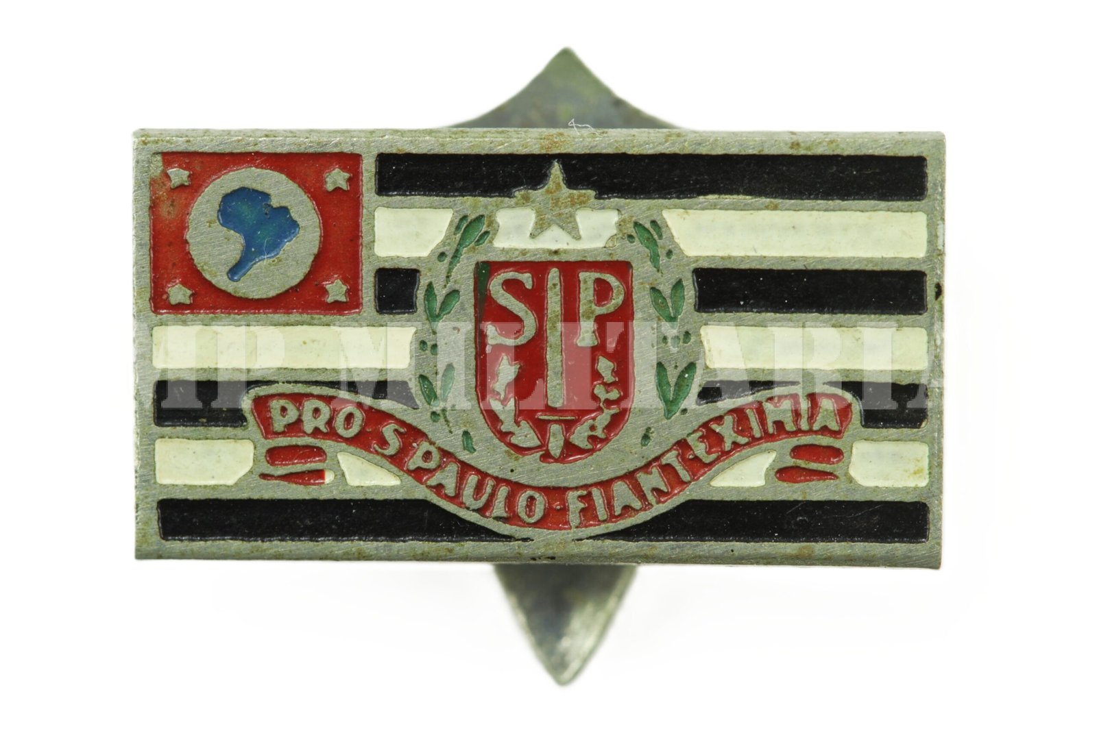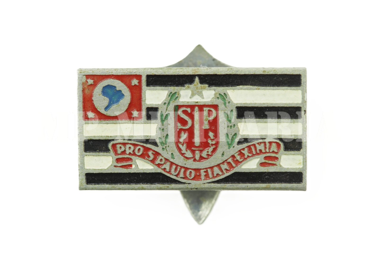 Pin da bandeira paulista com brasão do Estado de São Paulo e a legenda “Pro S. Paulo Fiant Eximia” (Por São Paulo Façam-se Grandes Coisas), da época da Revolução de 1932;