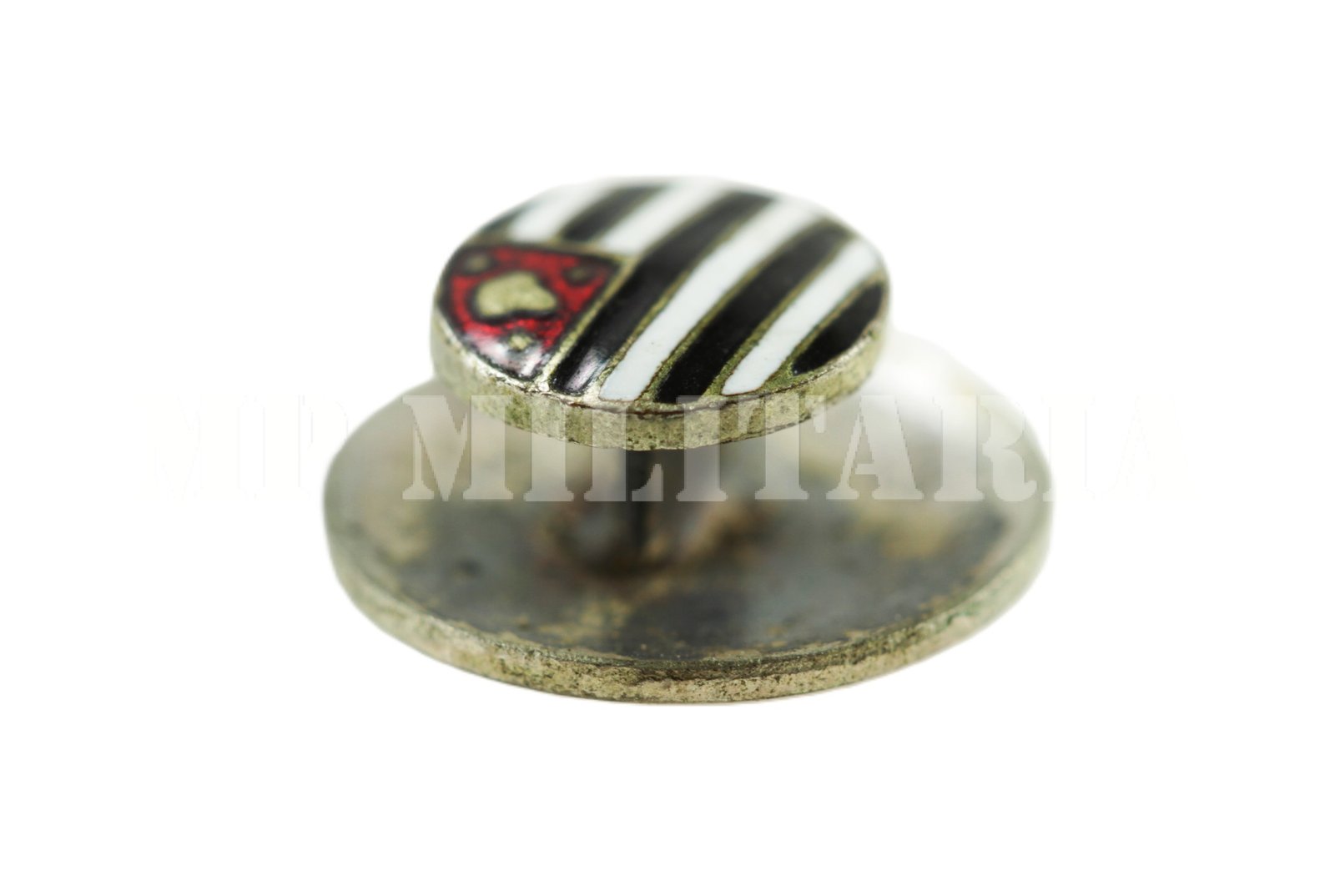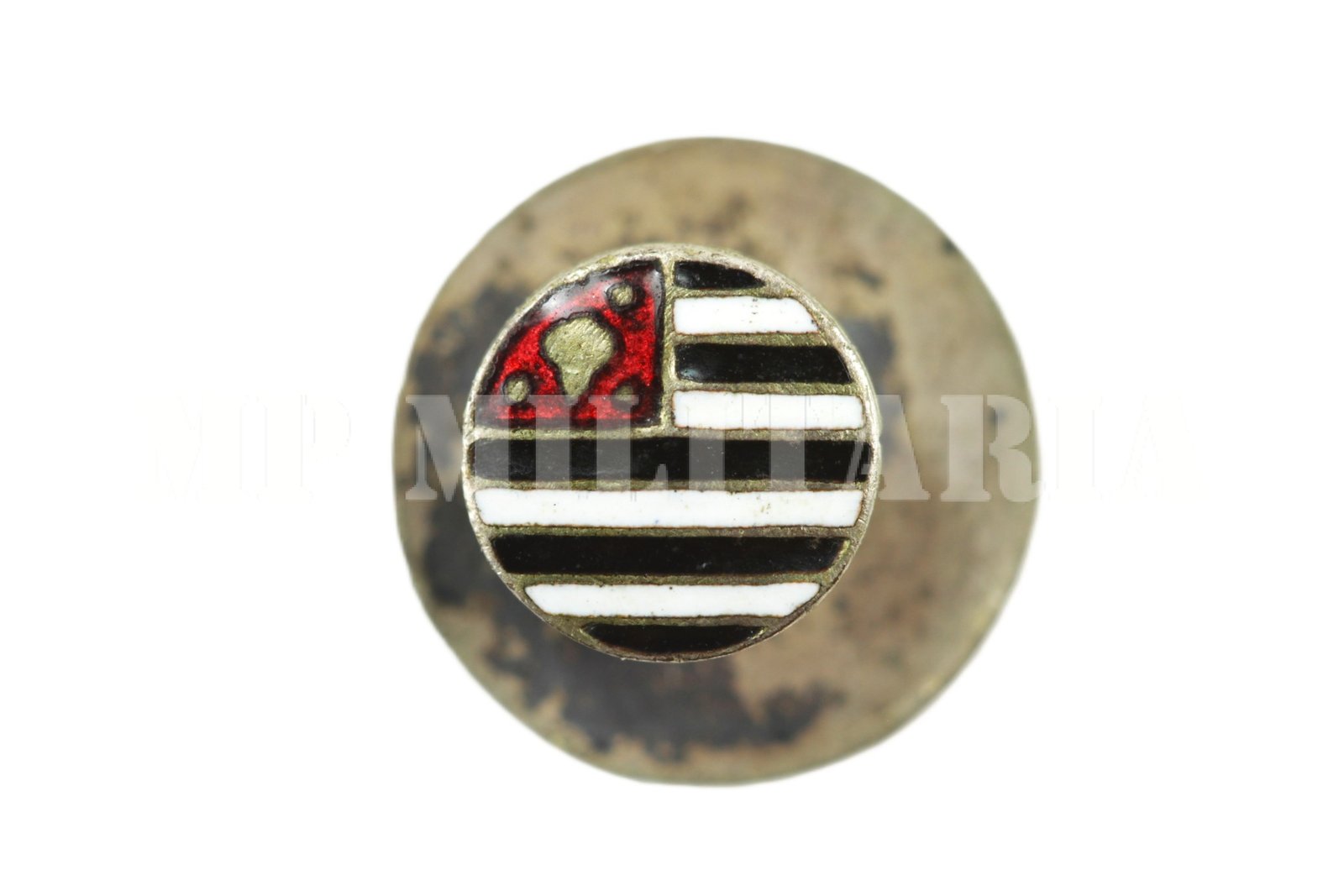 Pin descrito no Álbum Paulista como “Distintivo redondo bandeira paulista (o menor distintivo Executado), feito durante a Revolução Constitucionalista de 1932;
