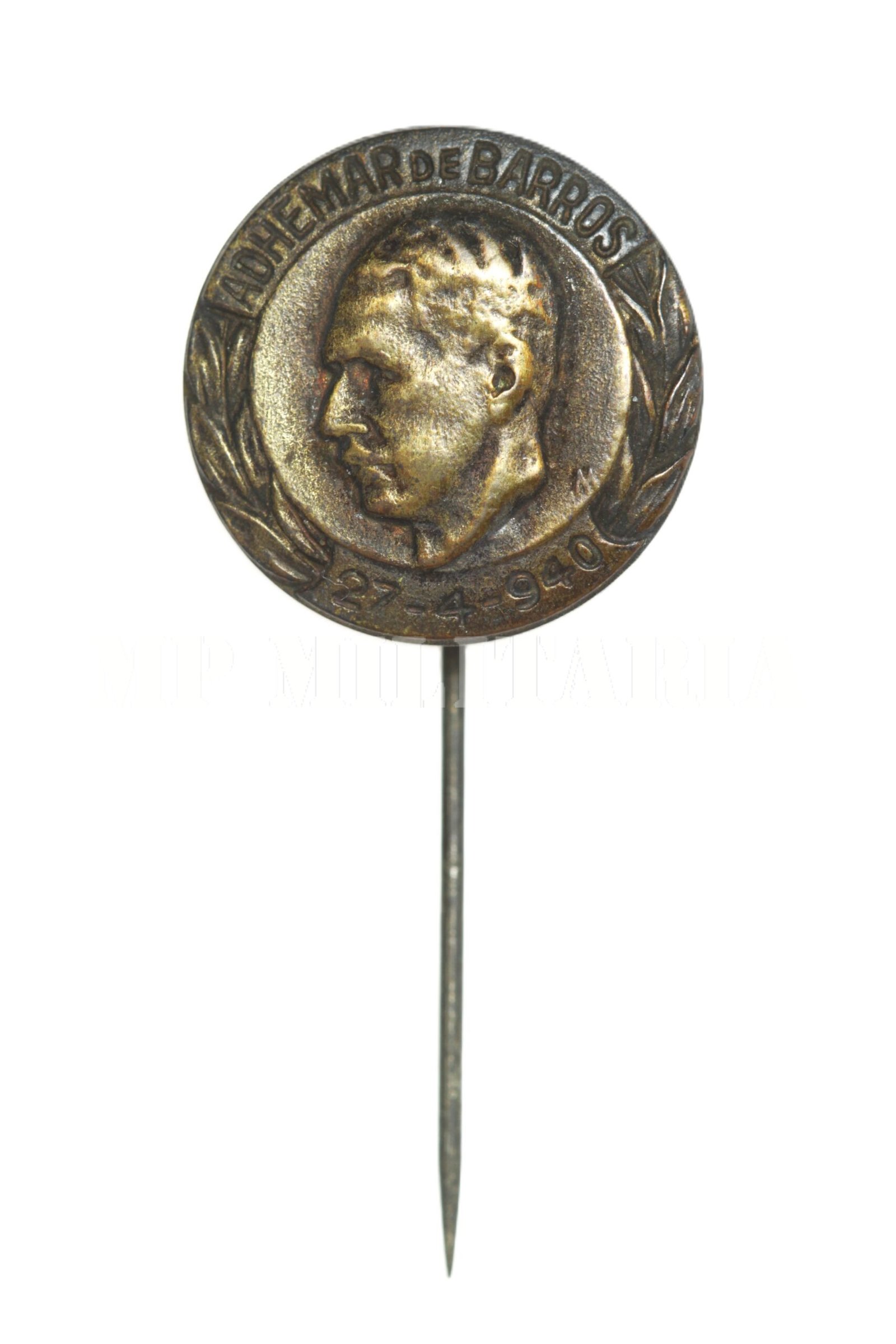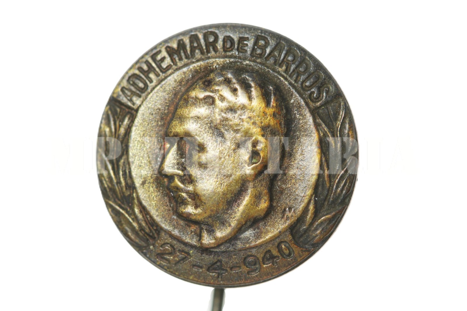 Pin da inauguração do Estadio do Pacaembu, pelo então interventor do Estado de São Paulo Adhemar de Barros (interventor de 1938 a 1941); apresenta a data da inauguração “27-4-1940”;