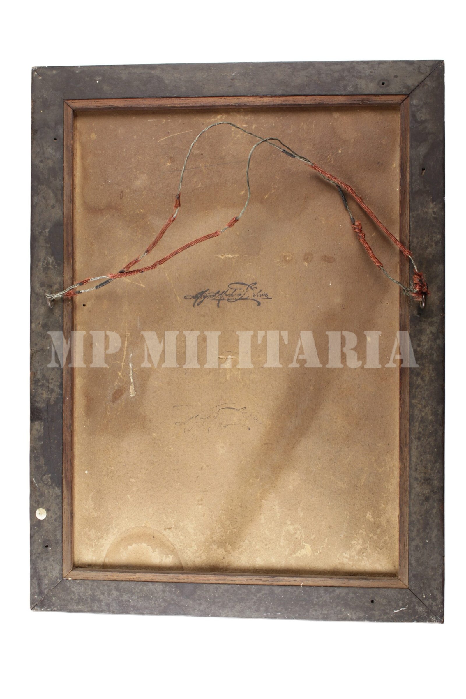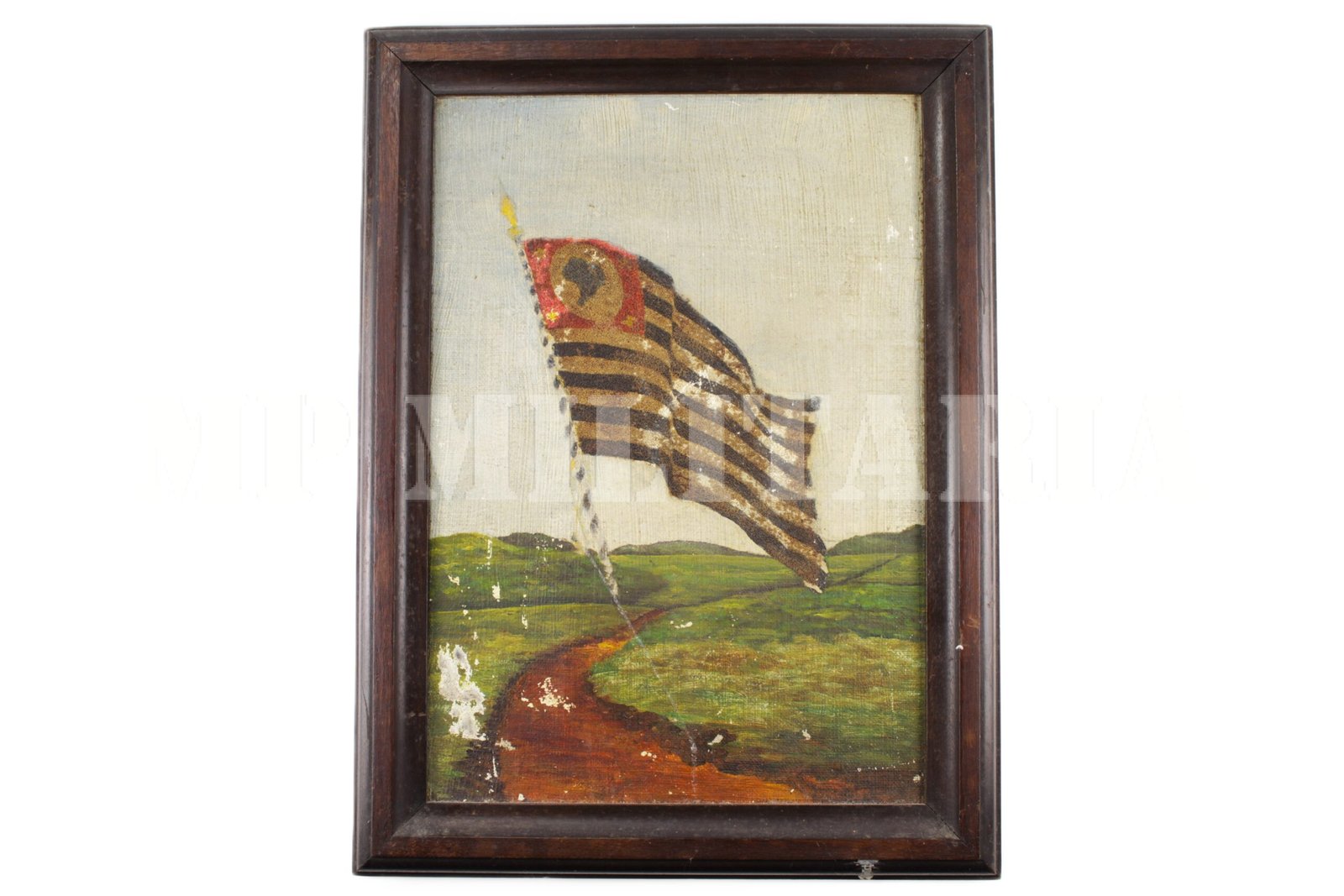 Quadro com a pintura da bandeira paulista, flutuando sobre uma estrada, da época da Revolução de 1932;