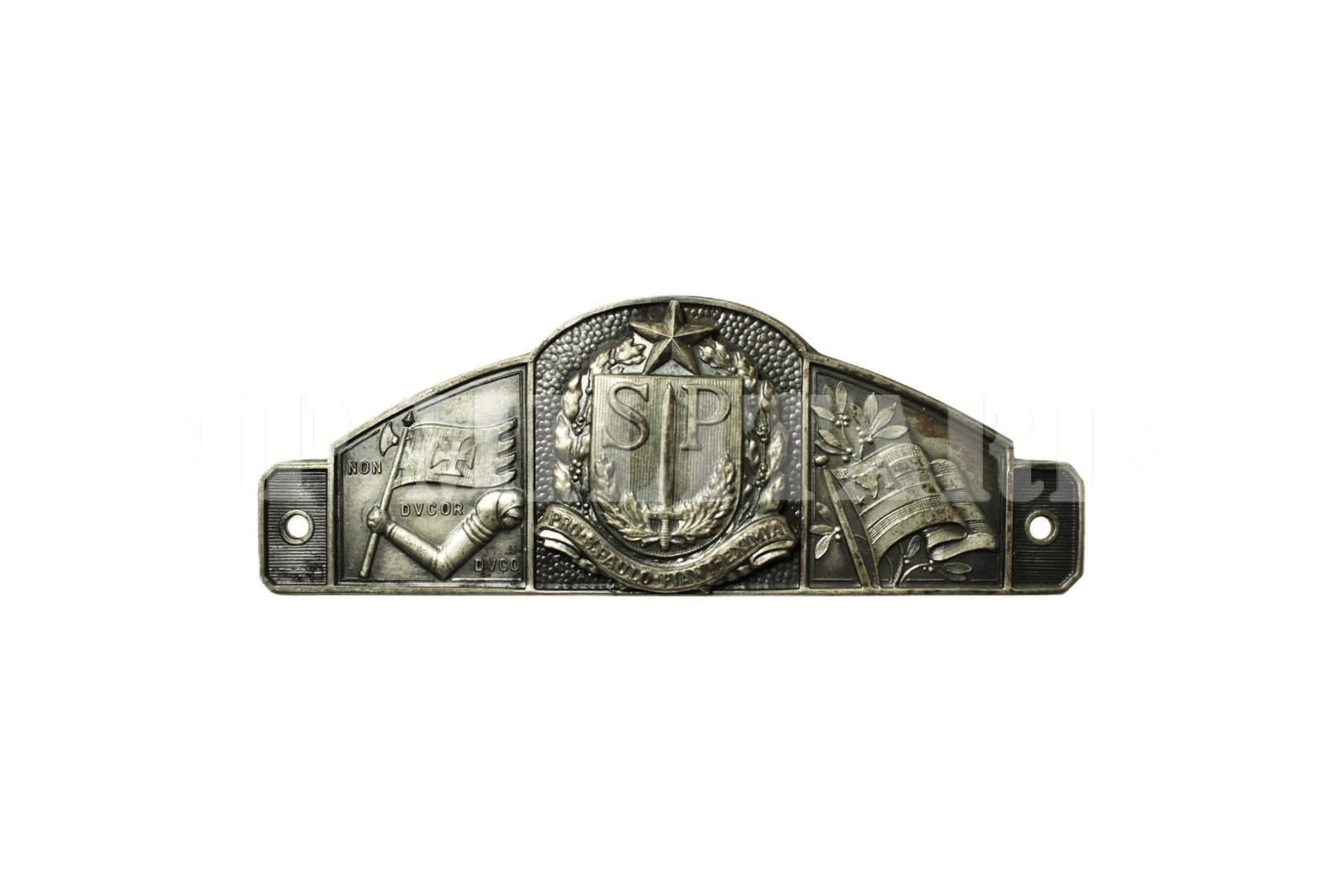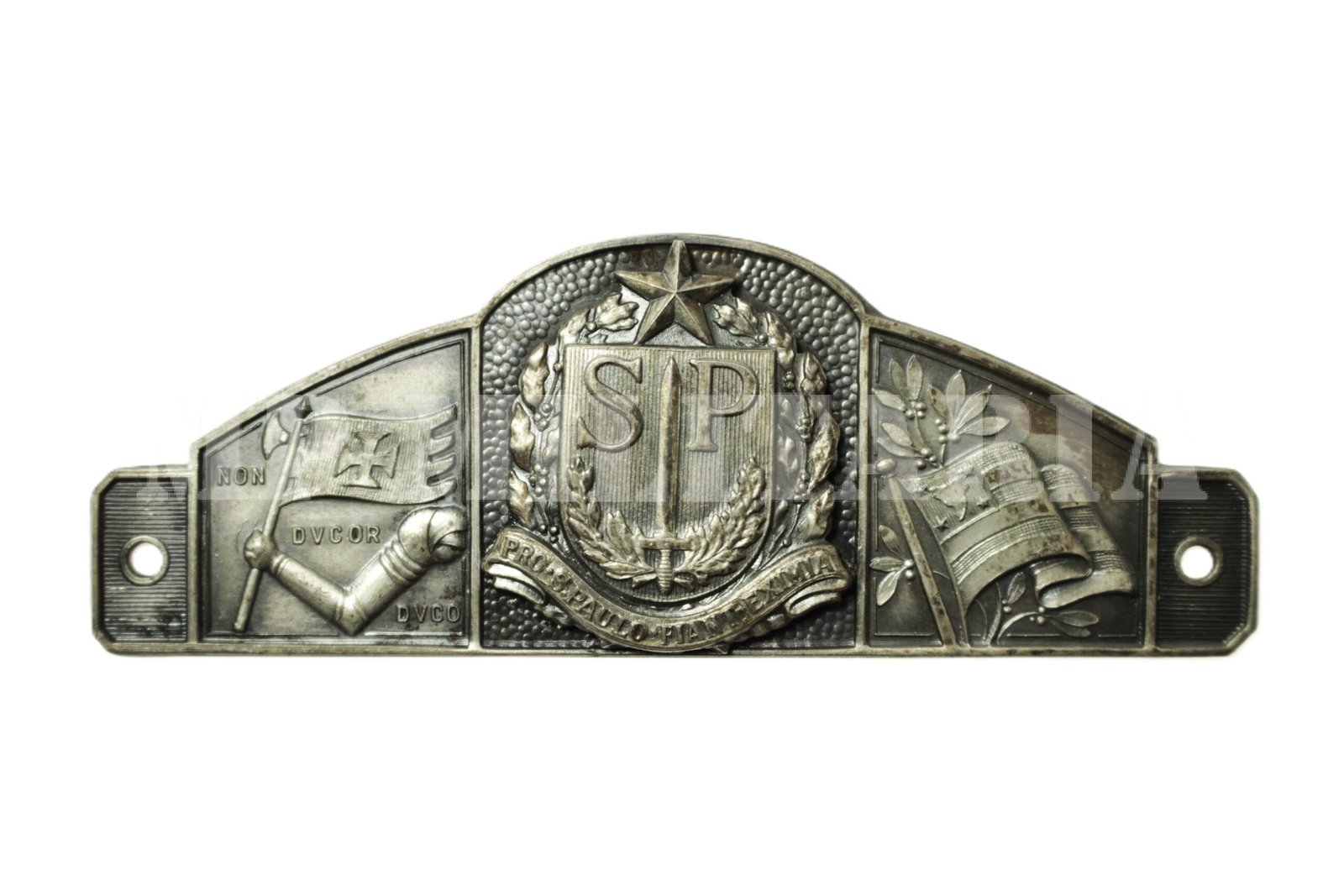 Linda placa com o brasão (Pro São Paulo), bandeira do estado e símbolo do município (Non Dvcor Dvco), estampados no metal;