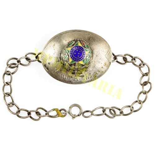 Pulseira com o brasão das Armas do Brasil ainda com a inscrição “Estados Unidos do Brasil”, apresenta o nome do militar gravado a buril;