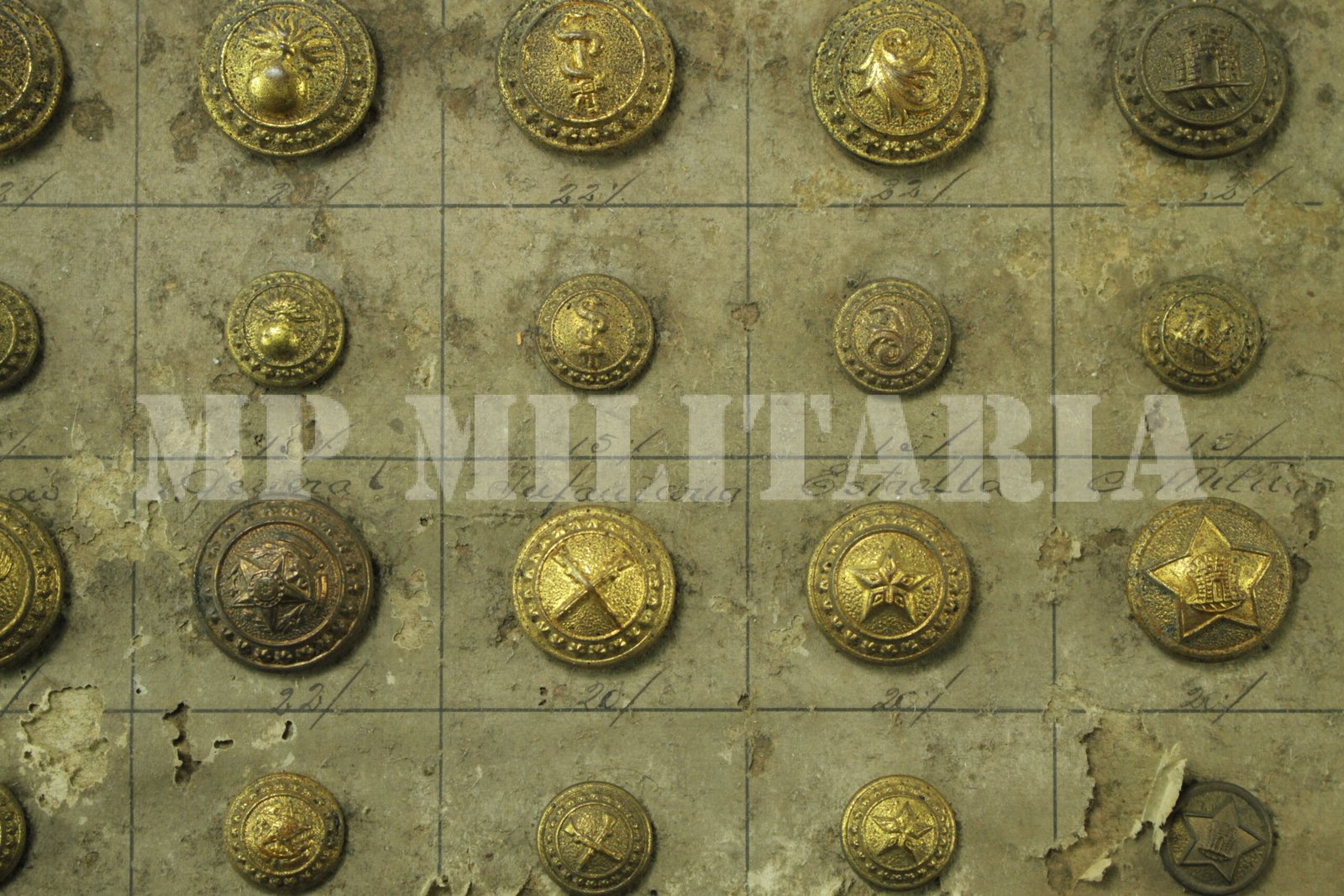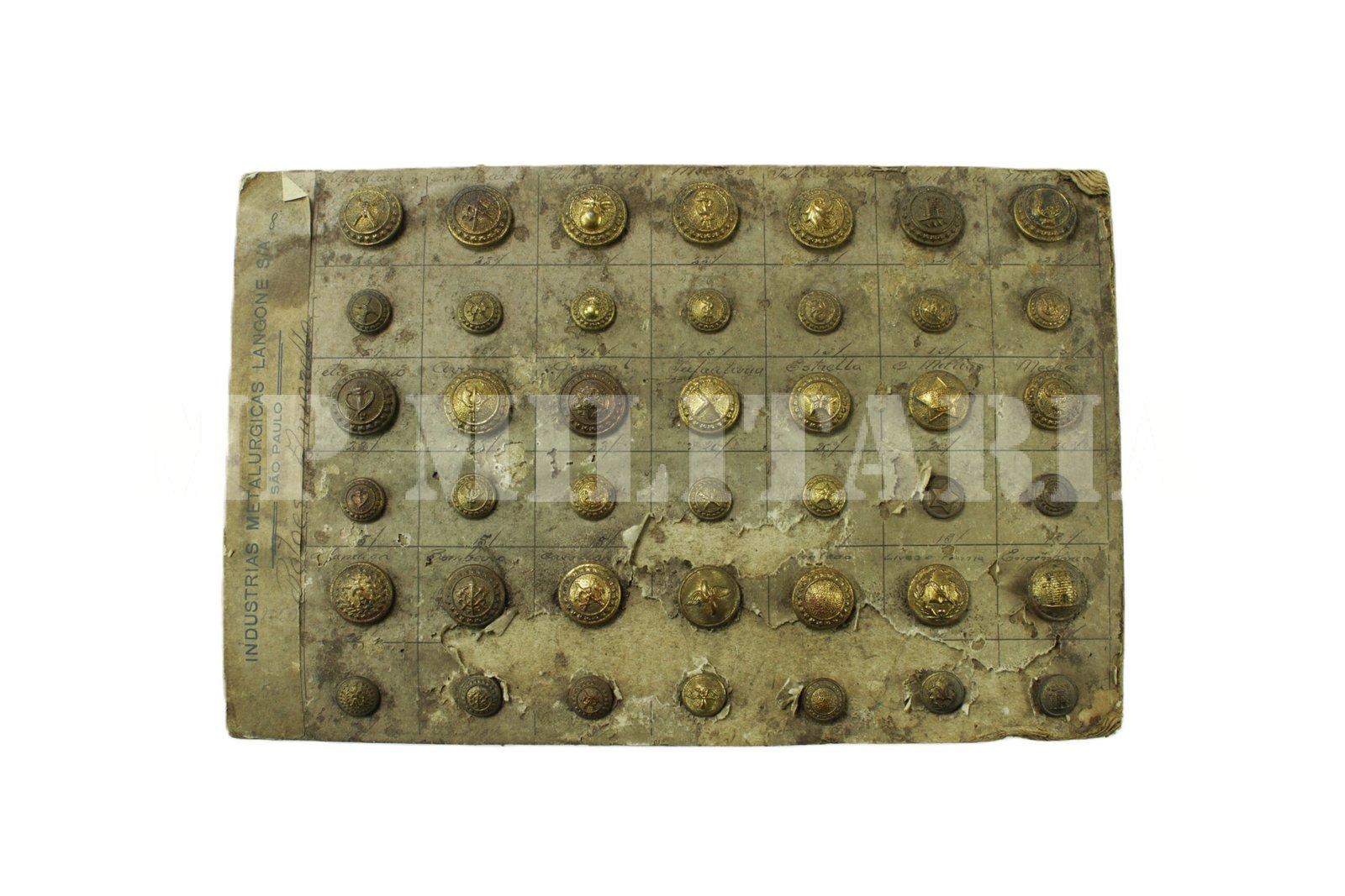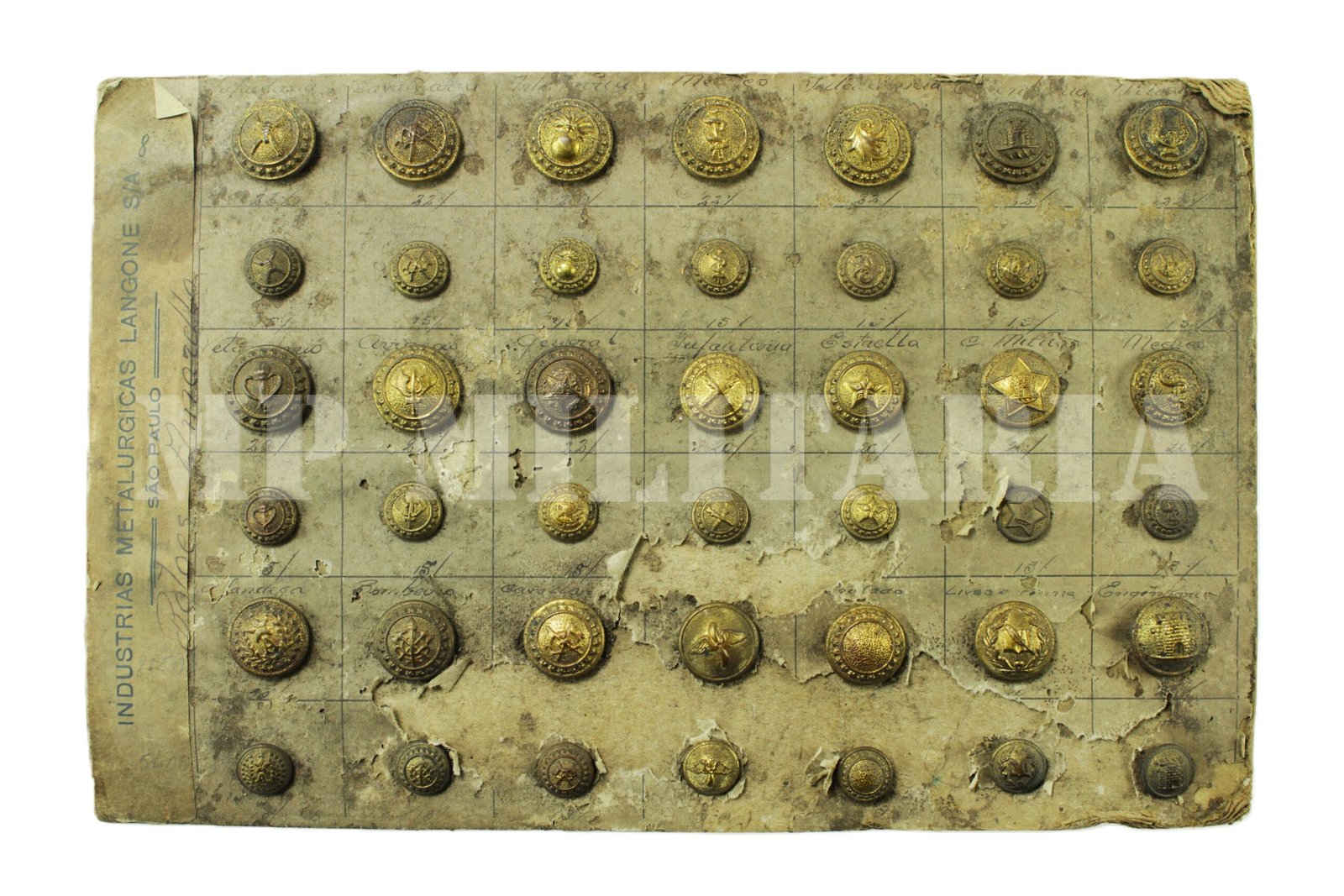 Rara coleção de botões militares dos anos 1930, era o mostruário da extinta Indústria Metalúrgica Langone, conjunto composto por quarenta e dois botões, fixados em uma cartela da empresa;