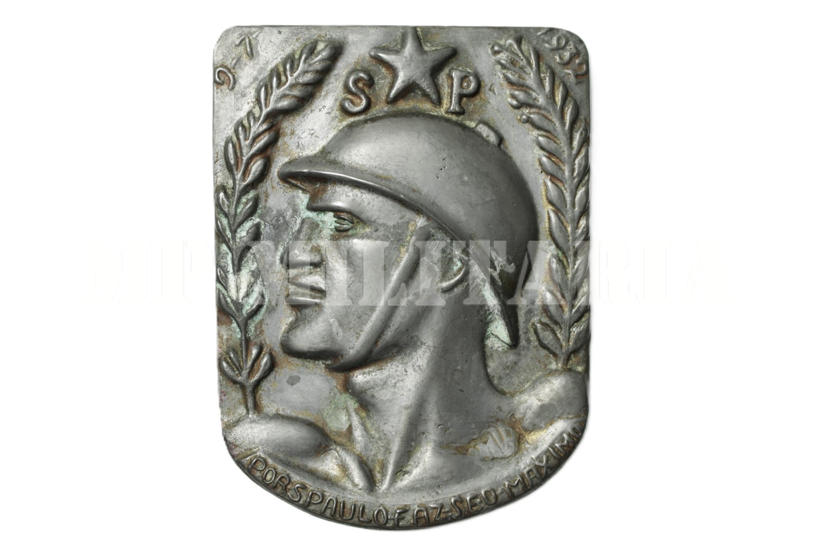 Rara placa do soldado da constituição, apresenta a inscrição: “Por São Paulo Faz-se o Máximo”. Feito durante a Revolução Constitucionalista de 1932;