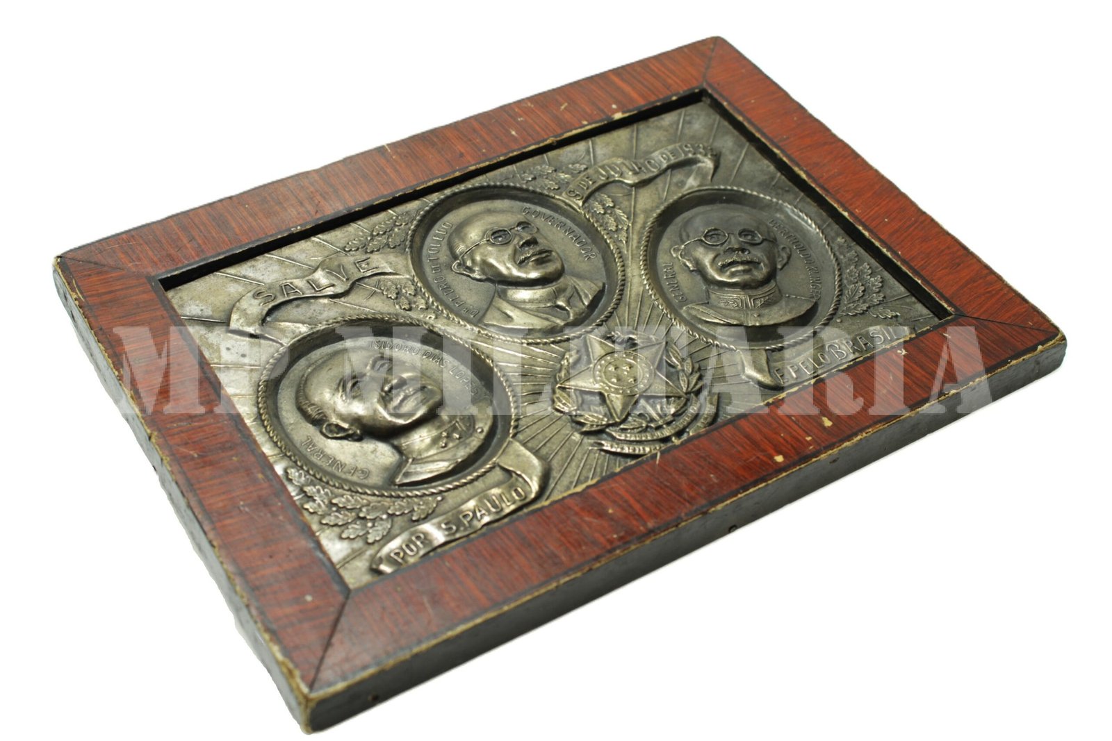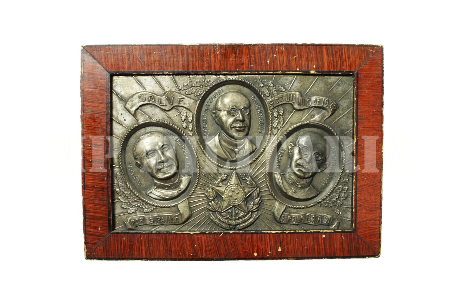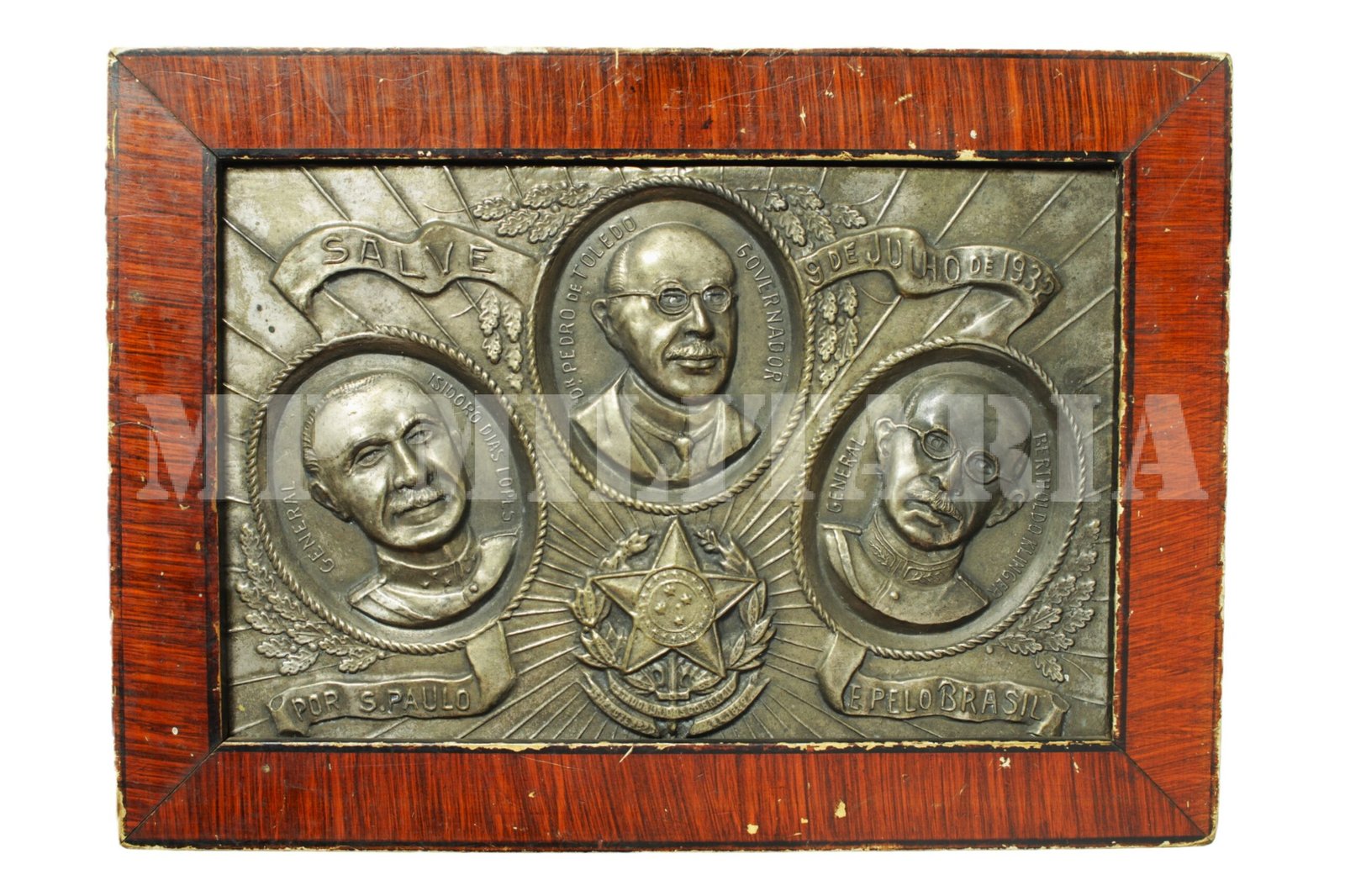 Raríssimo quadro feito pela Cruz Vermelha (com etiqueta no verso), com as efigies dos Comandantes constitucionalistas, Governador Pedro de Toledo ao centro, sobre o brasão de armas do Brasil, ladeado pelos Generais Isidoro Dias Lopes e Bertholdo Klinger, sobre uma faixa com a inscrição: “Salve 9 de julho – Por São Paulo e Pelo Brasil”;