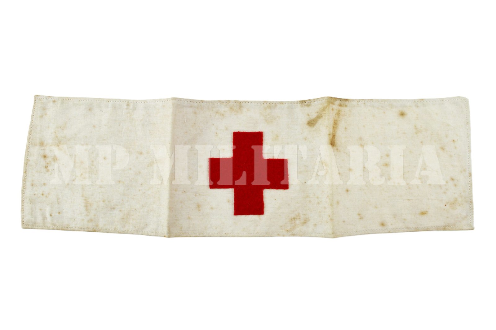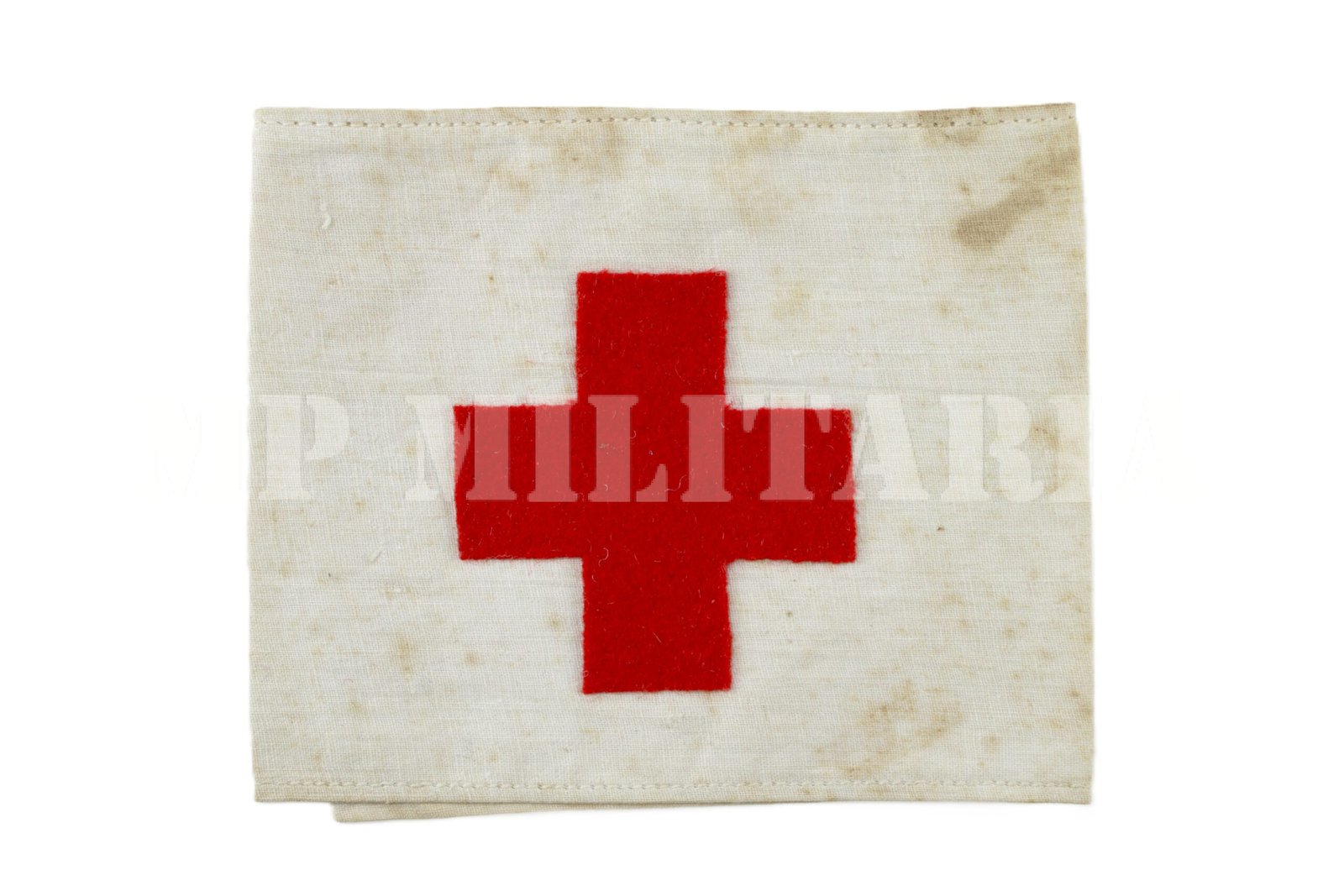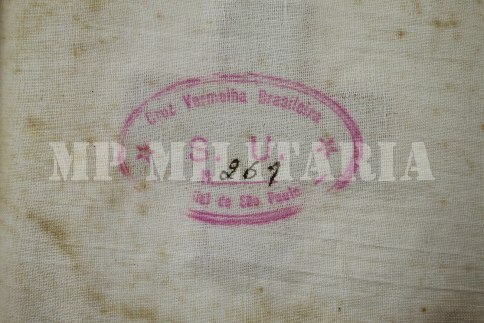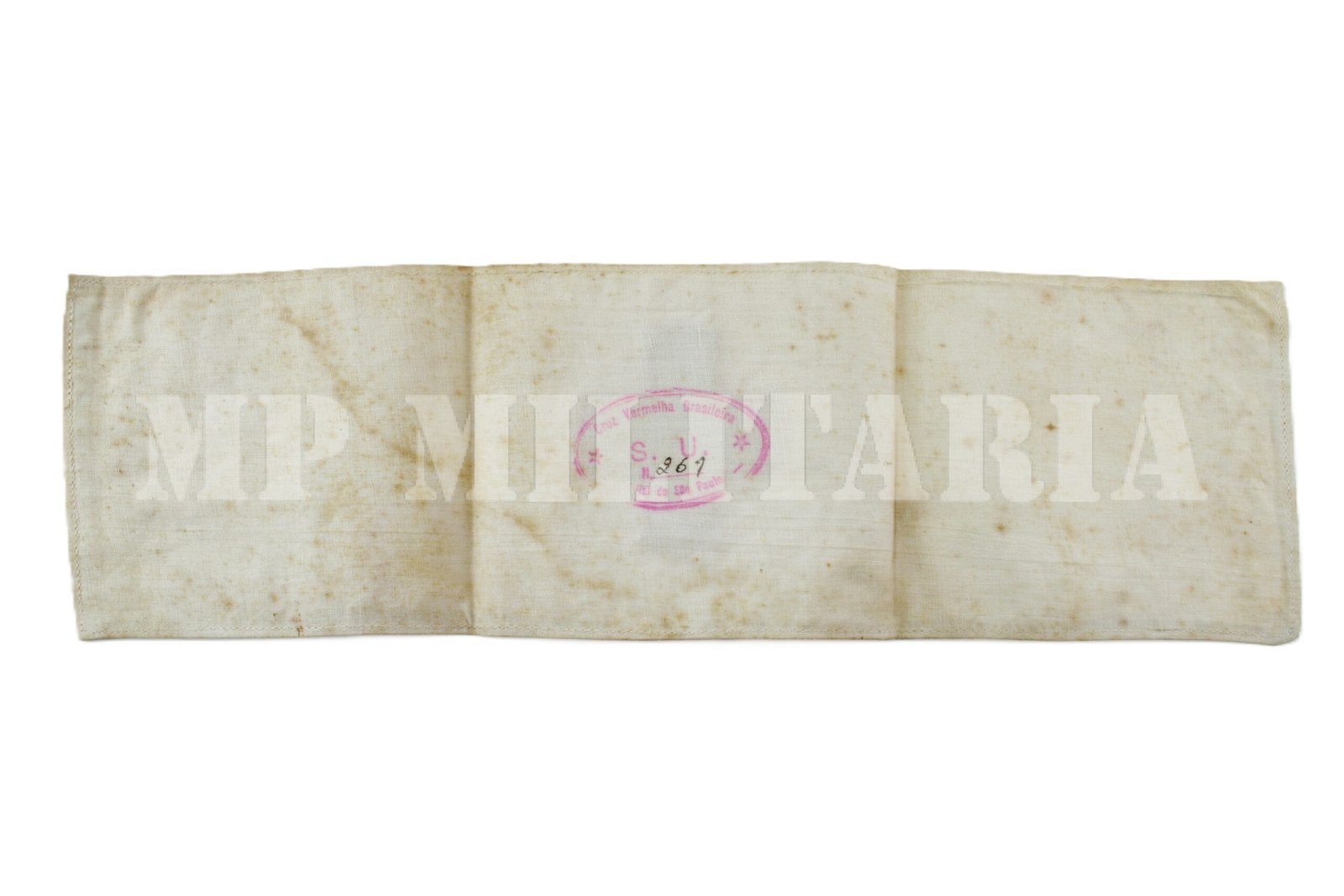 Raro braçal da Cruz Vermelha para médicos, enfermeiras ou padioleiros, apresenta um carimbo da “Cruz Vermelha Brasileira – Filial São Paulo”, do período da Revolução Constitucionalista de 1932;