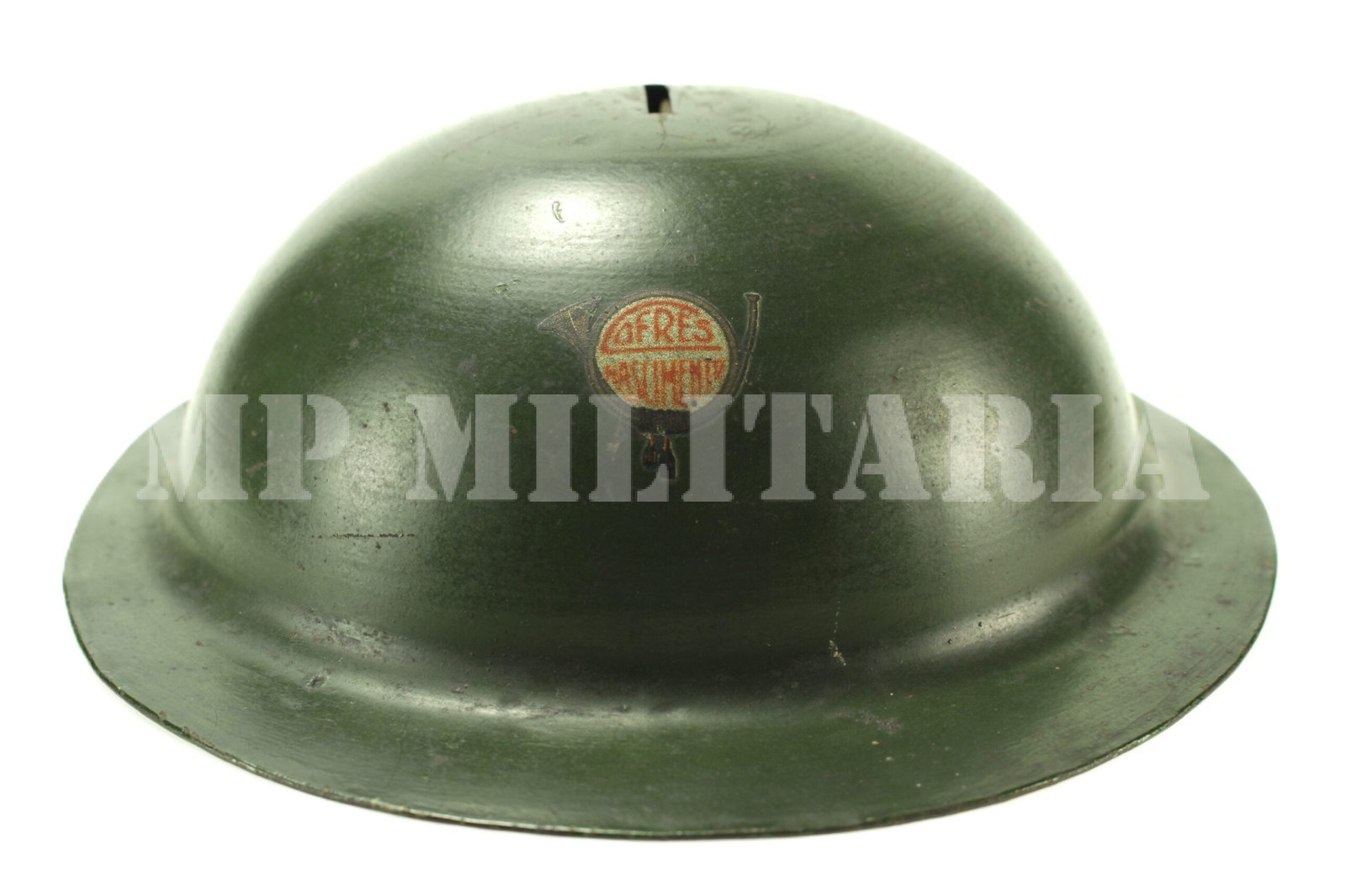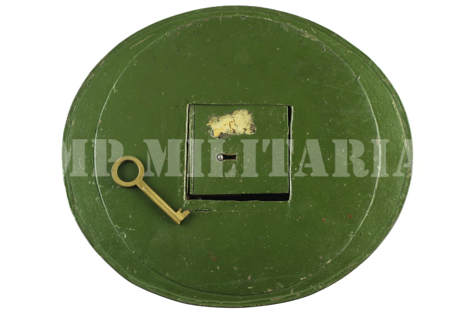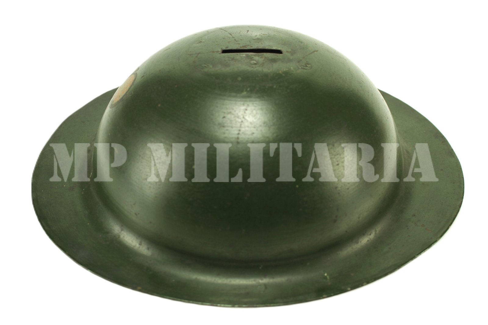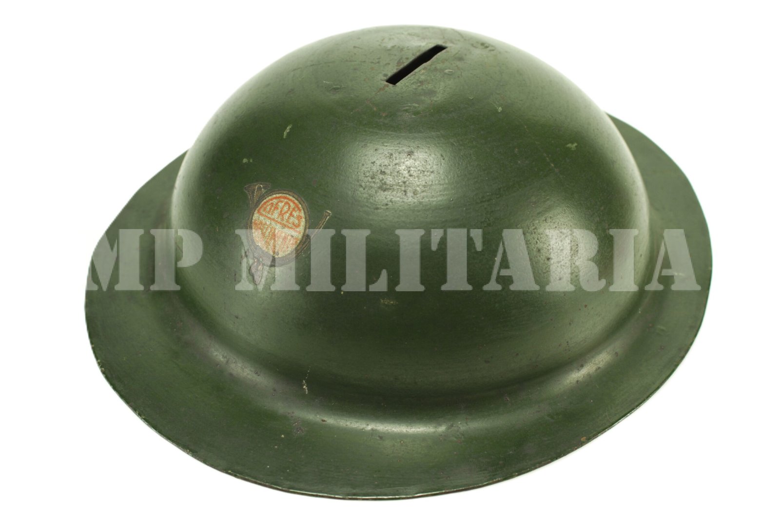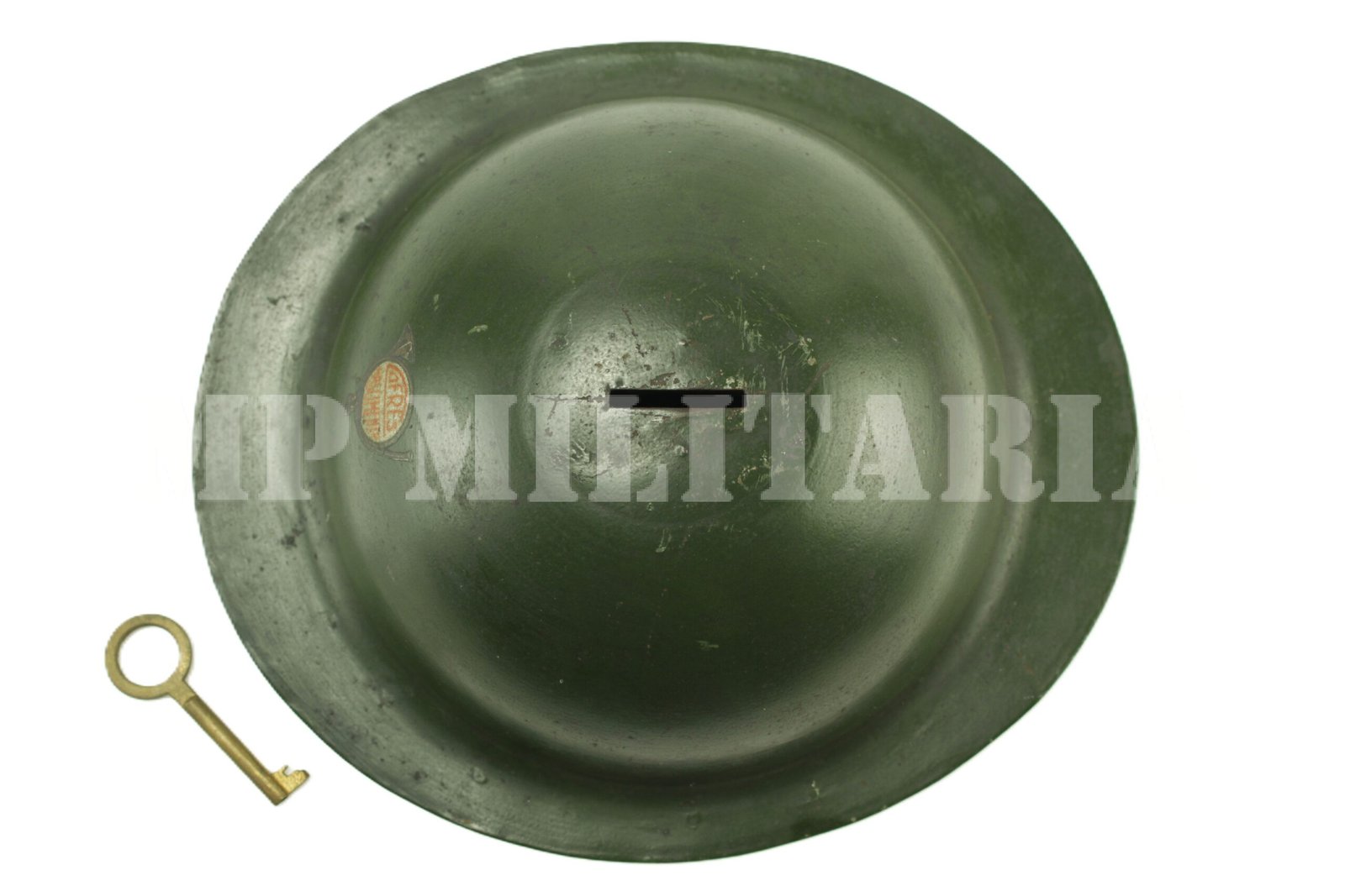 Raro cofrinho de metal no formato do capacete modelo inglês, feito durante a Revolução Constitucionalista de 1932, acompanha a chave para abrir o cofre;