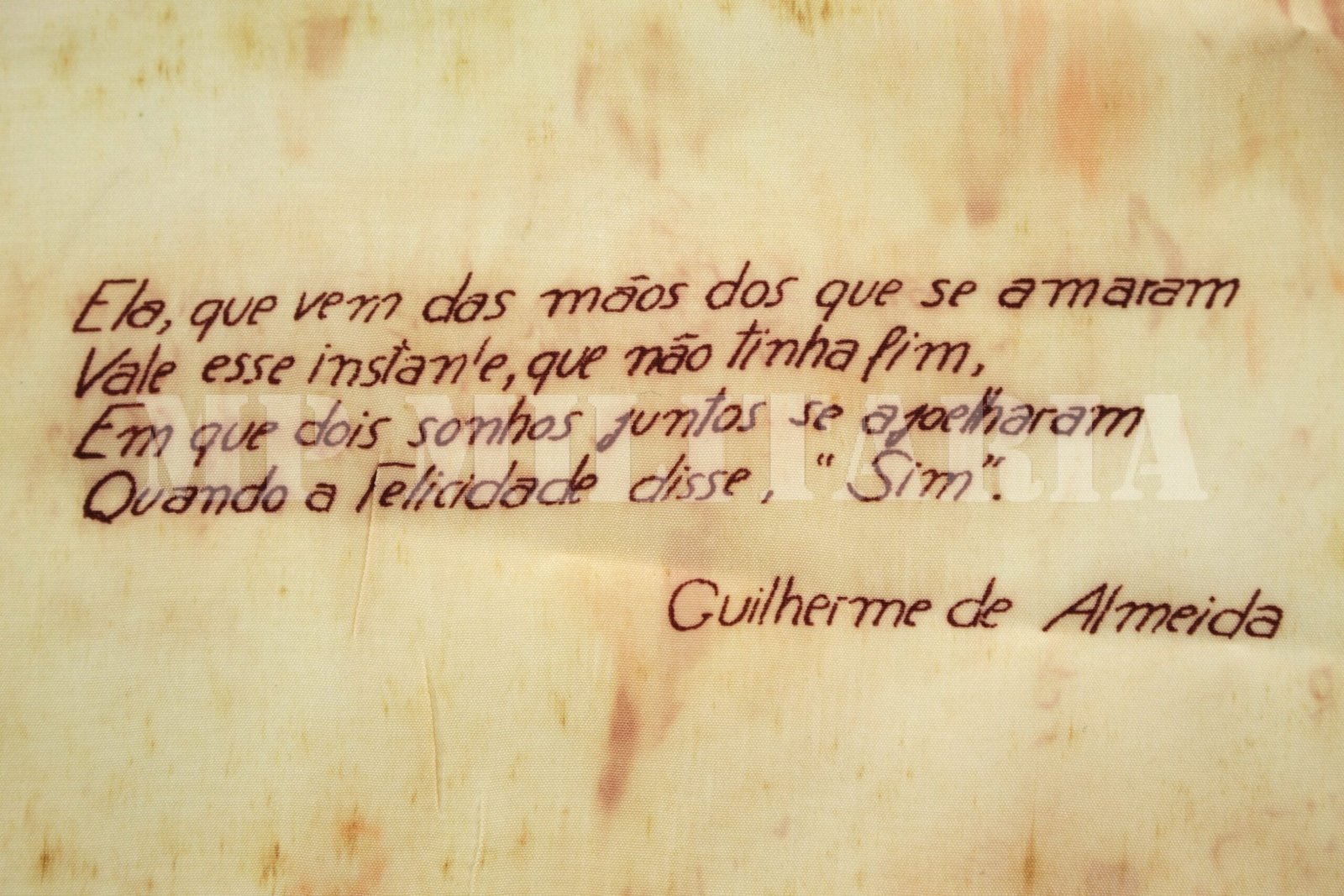 Raro lenço com o poema Moeda Paulista de Guilherme de Almeida, estampado;