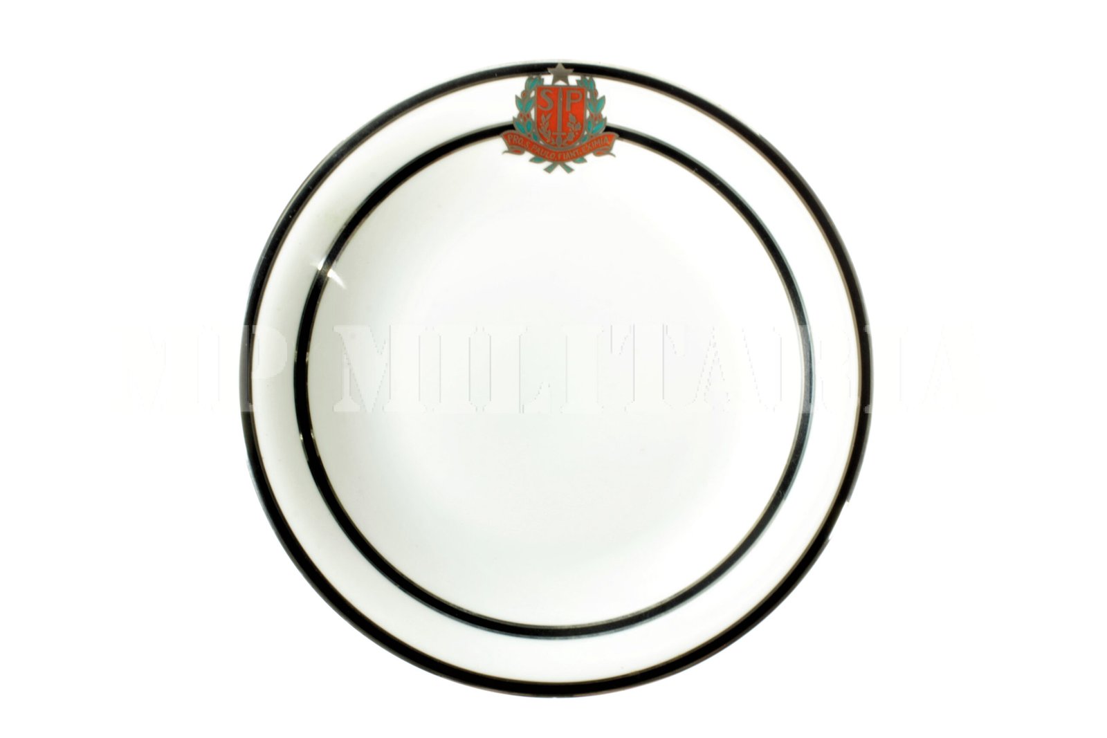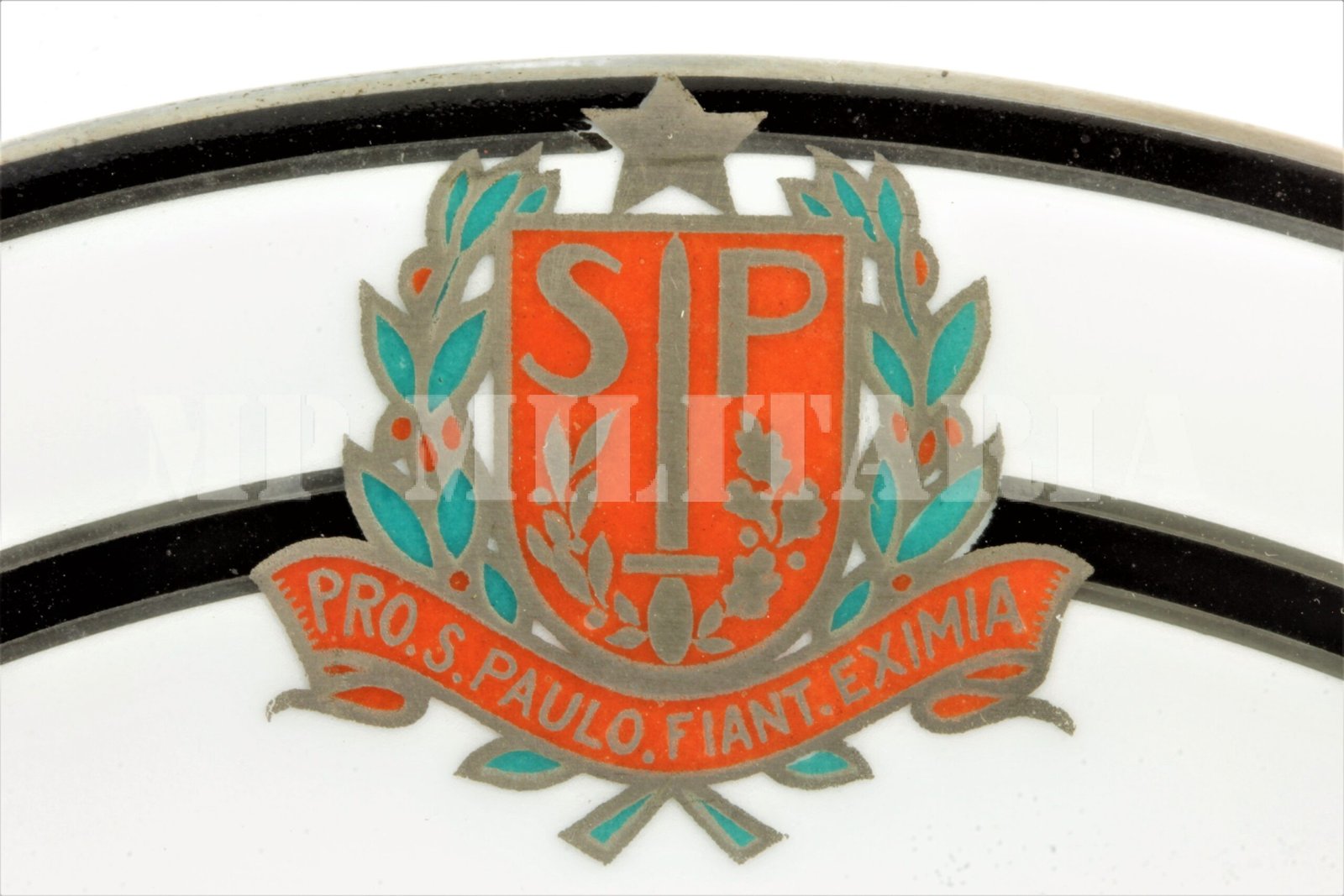 Raro prato brasonado da Revolução Constitucionalista de 1932, apresenta o brasão do Estado de São Paulo com a legenda “Pro S. Paulo Fiant Eximia” (Por São Paulo Façam-se Grandes Coisas), fabricado em Limoges – França;