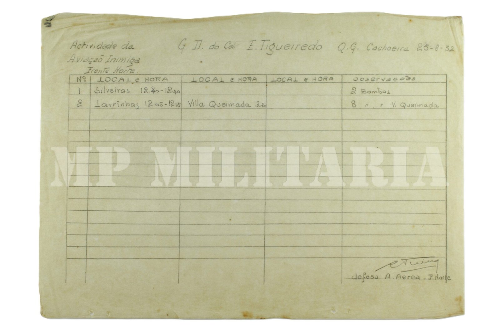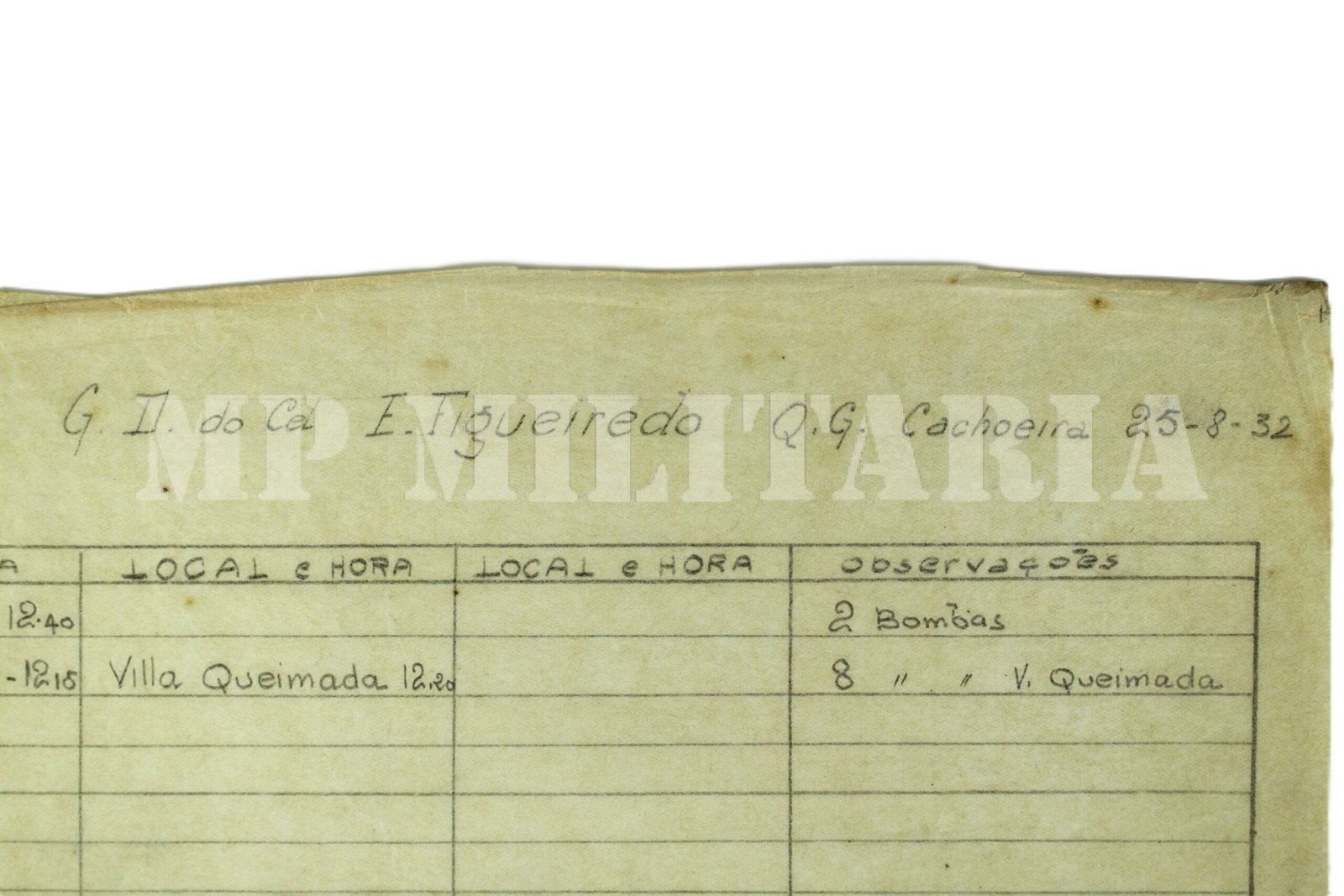 RELATÓRIO DA AVIAÇÃO INIMIGA DO QG DO CORONEL FIGUEIREDO EM CACHOEIRA – REVOLUÇÃO DE 1932