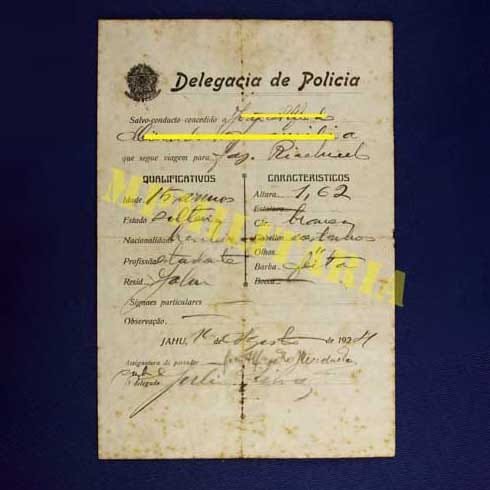 Raro Salvo Conduto da “Revolução de 1924” emitido em 16 de agosto de 1924 na cidade de Jaú estado de São Paulo.