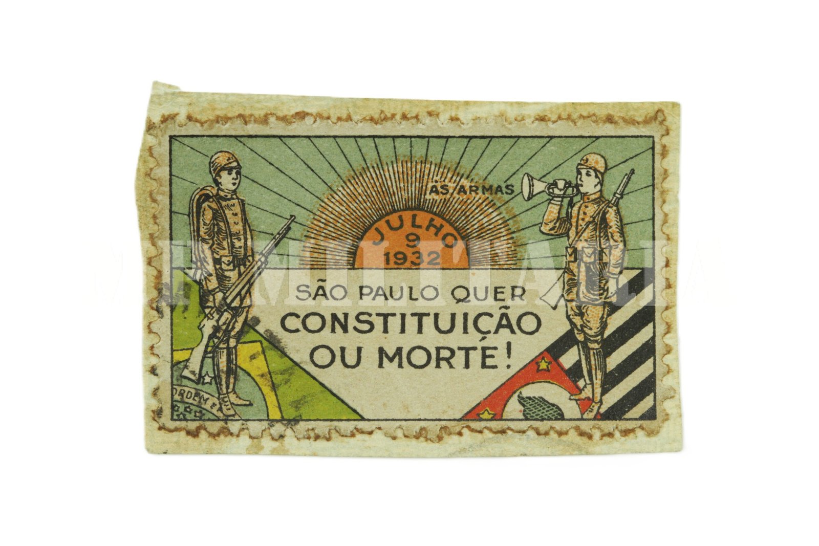 Selo / etiqueta filatélica “São Paulo quer Constituição ou Morte” do Correio Militar Paulista circulado, consta no “Álbum Paulista” figurinha número 121;