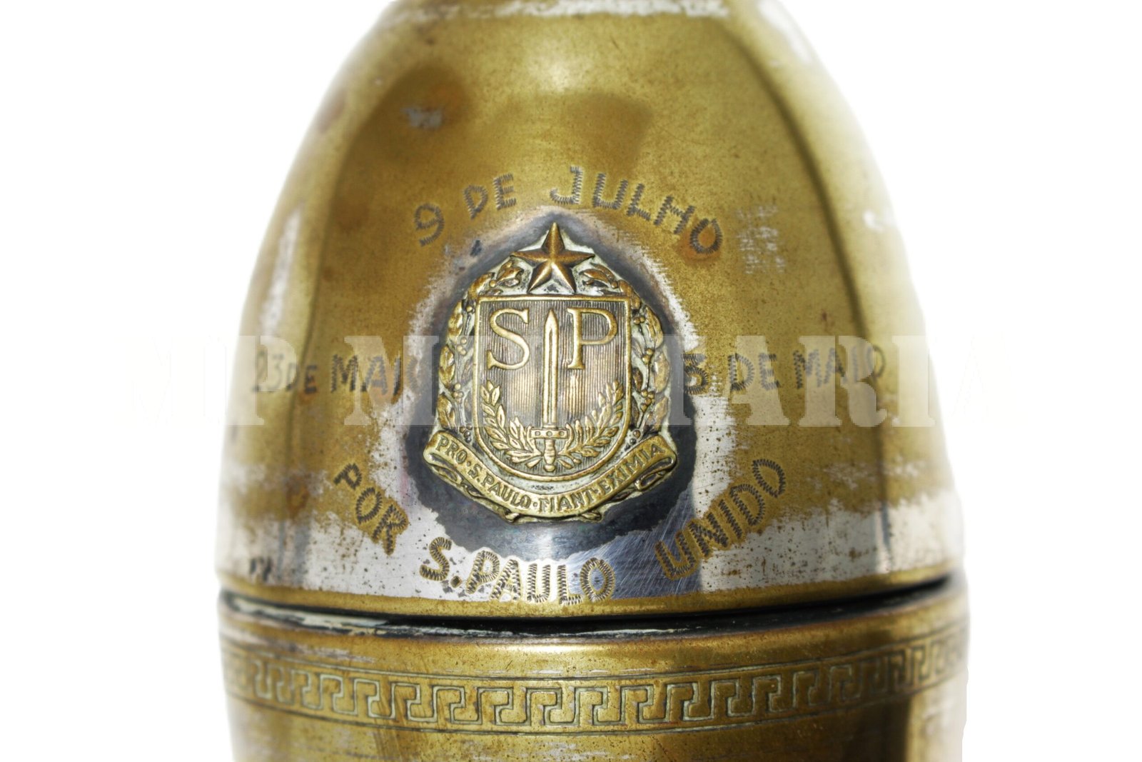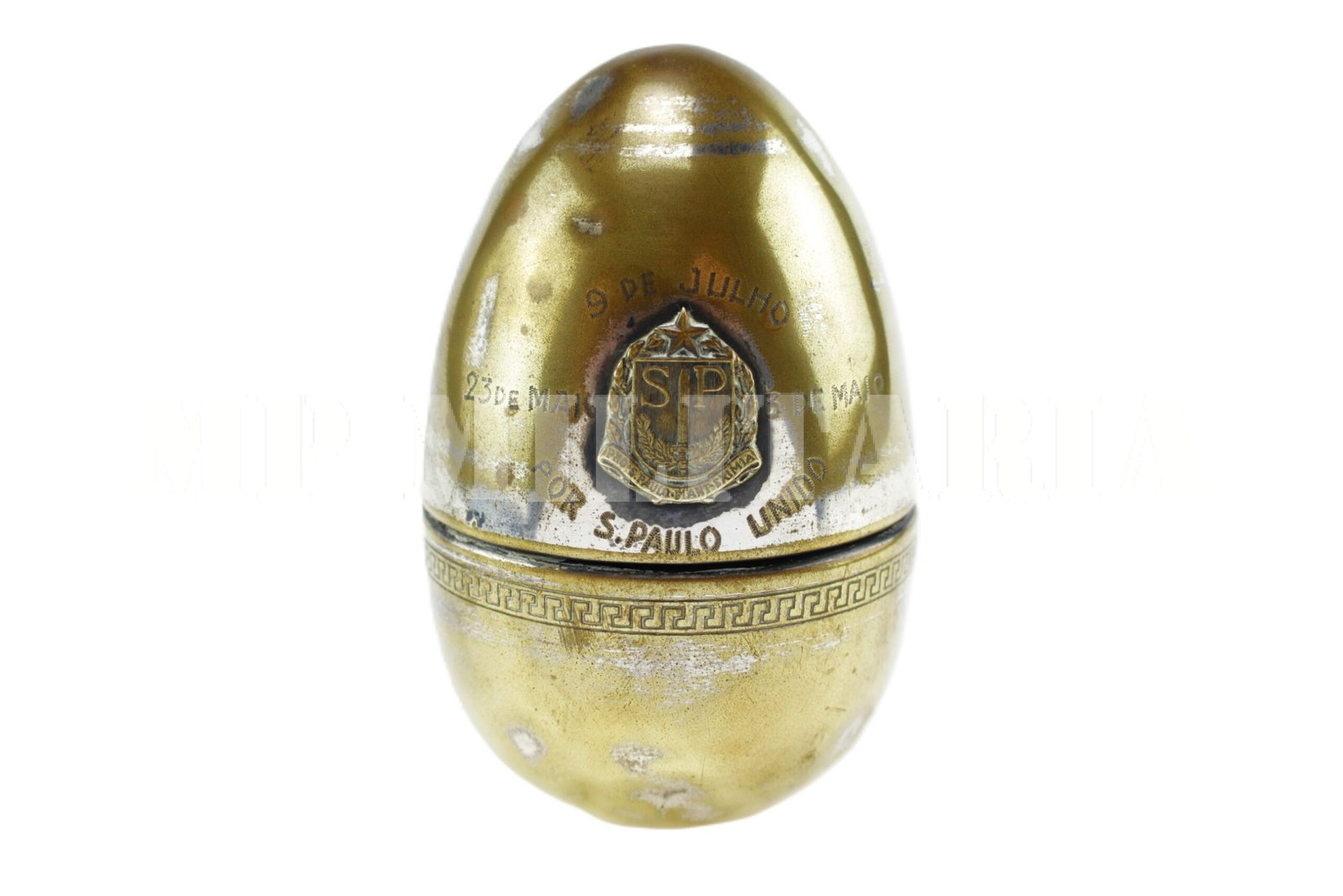 Souvenir Porta Joia, com brasão Pró São Paulo e a inscrição gravada a buril “9 de julho – 23 de maio – Por São Paulo Unido”, formato oval, feito durante a Revolução Constitucionalista de 1932;