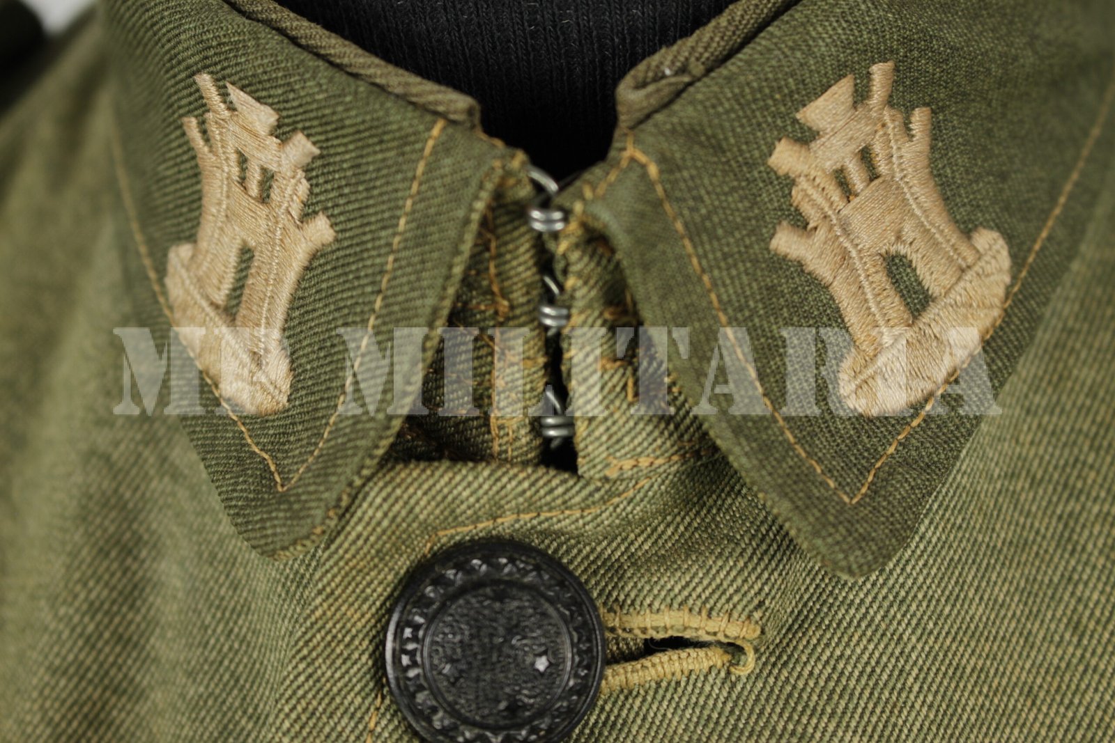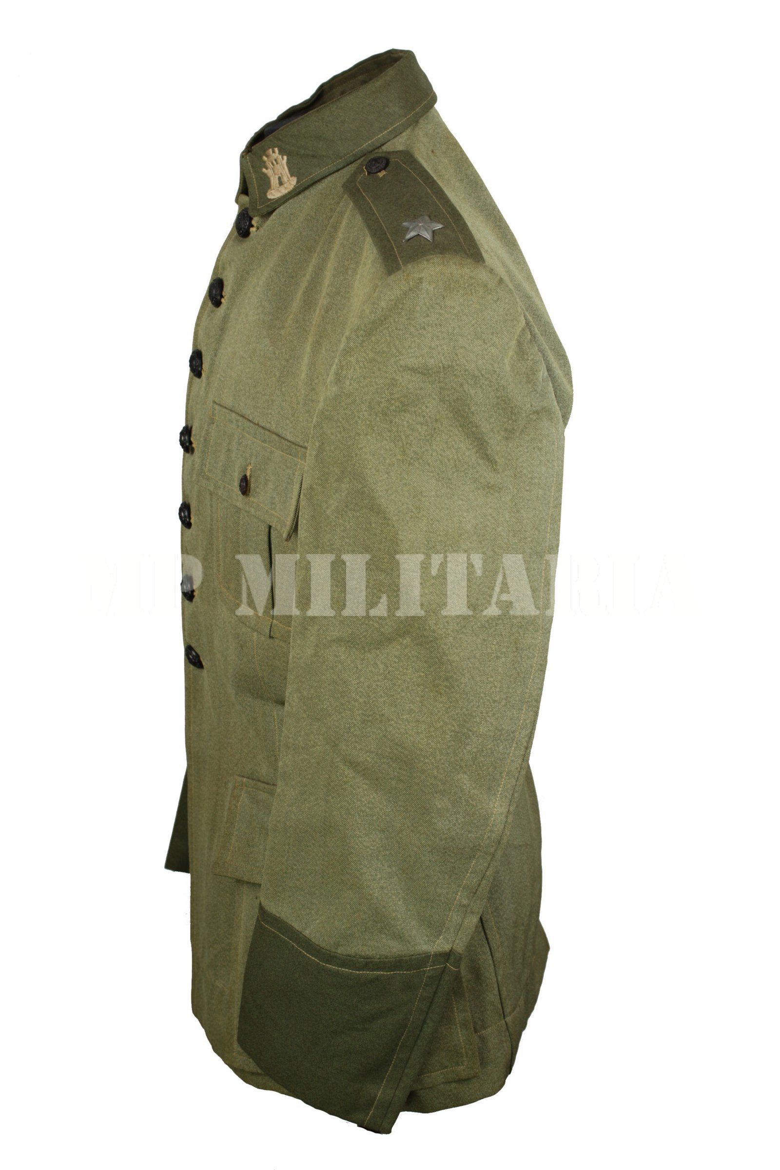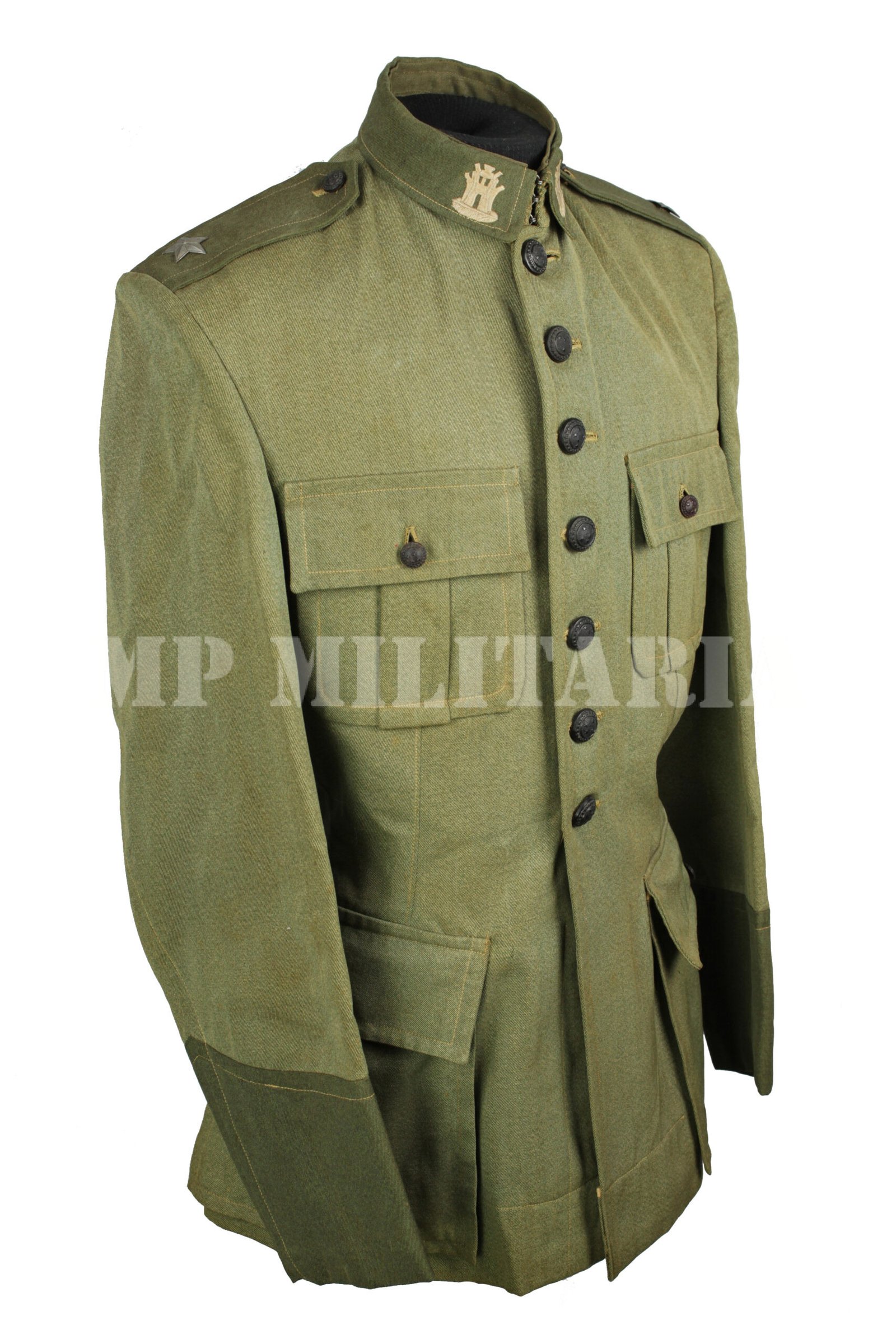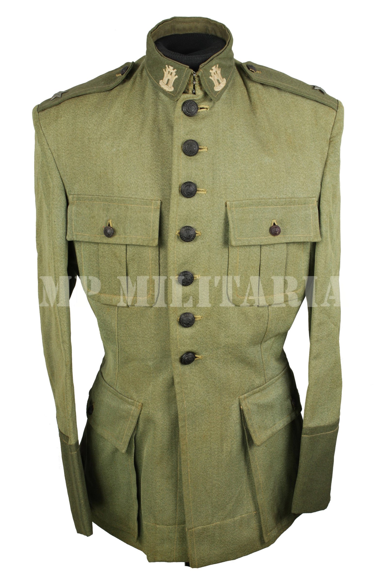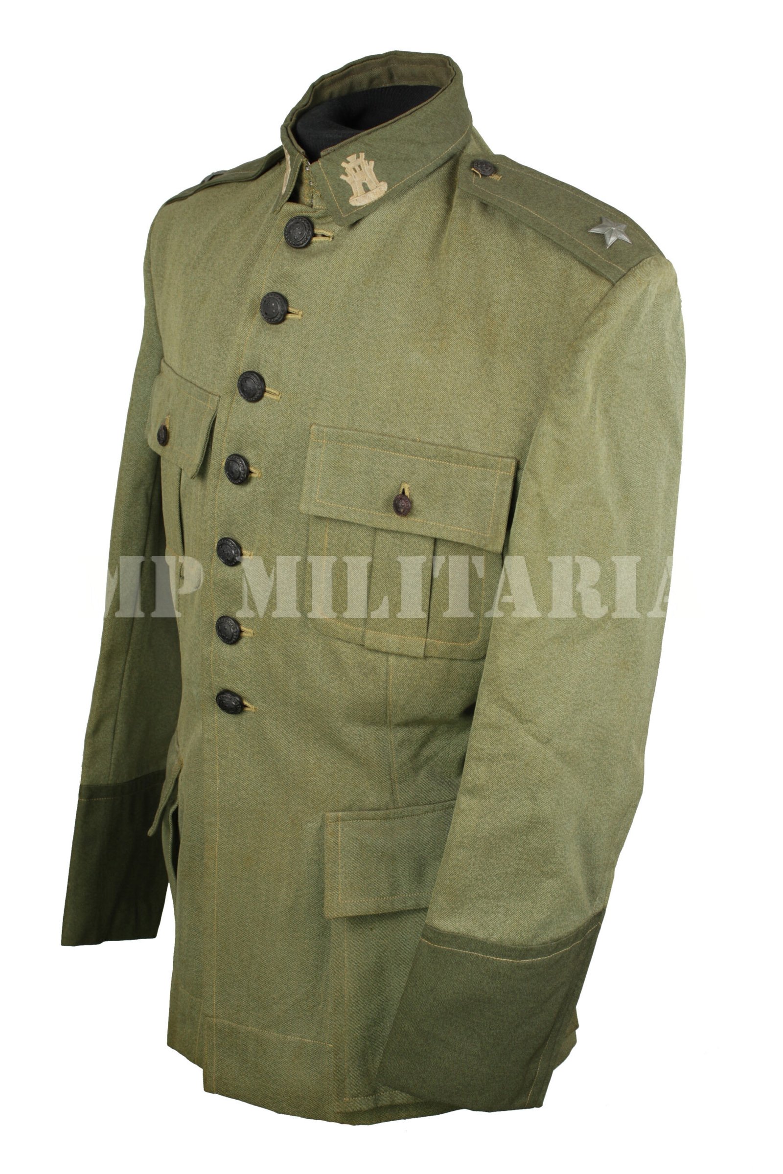 Túnica de Aspirante da arma de Engenharia do Exército Brasileiro, dos anos 1940, consta no R.U.P,E, – Regulamento de Uniformes do Pessoal do Exército de 1942;